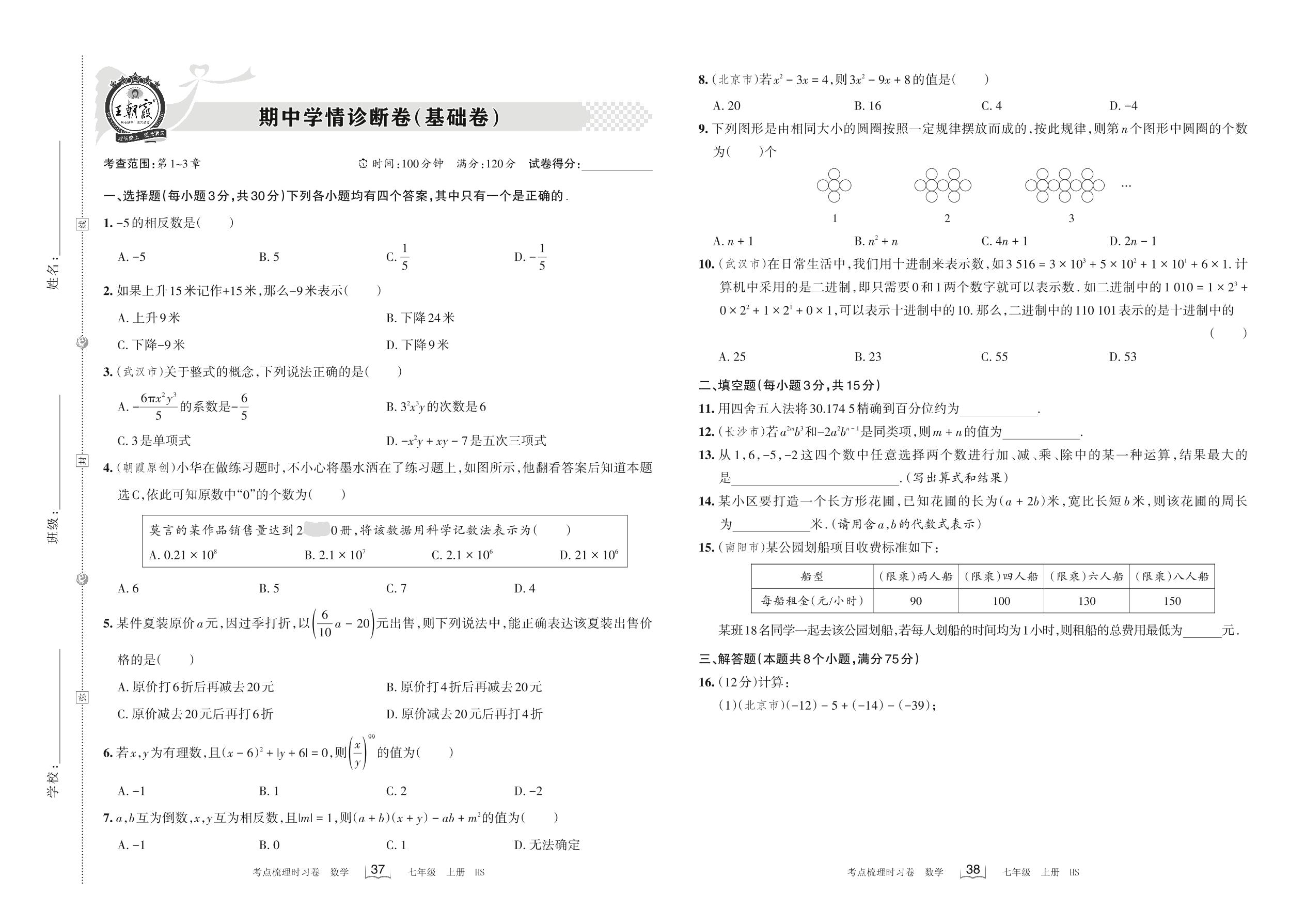 2022上册七年级数学华师版 期中学情诊断卷(基础卷)