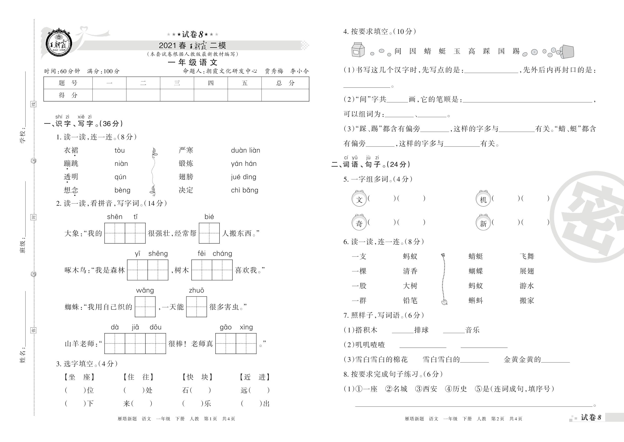 王朝霞期末模拟卷一年级下册语文(人教版)_R210731172452【8】