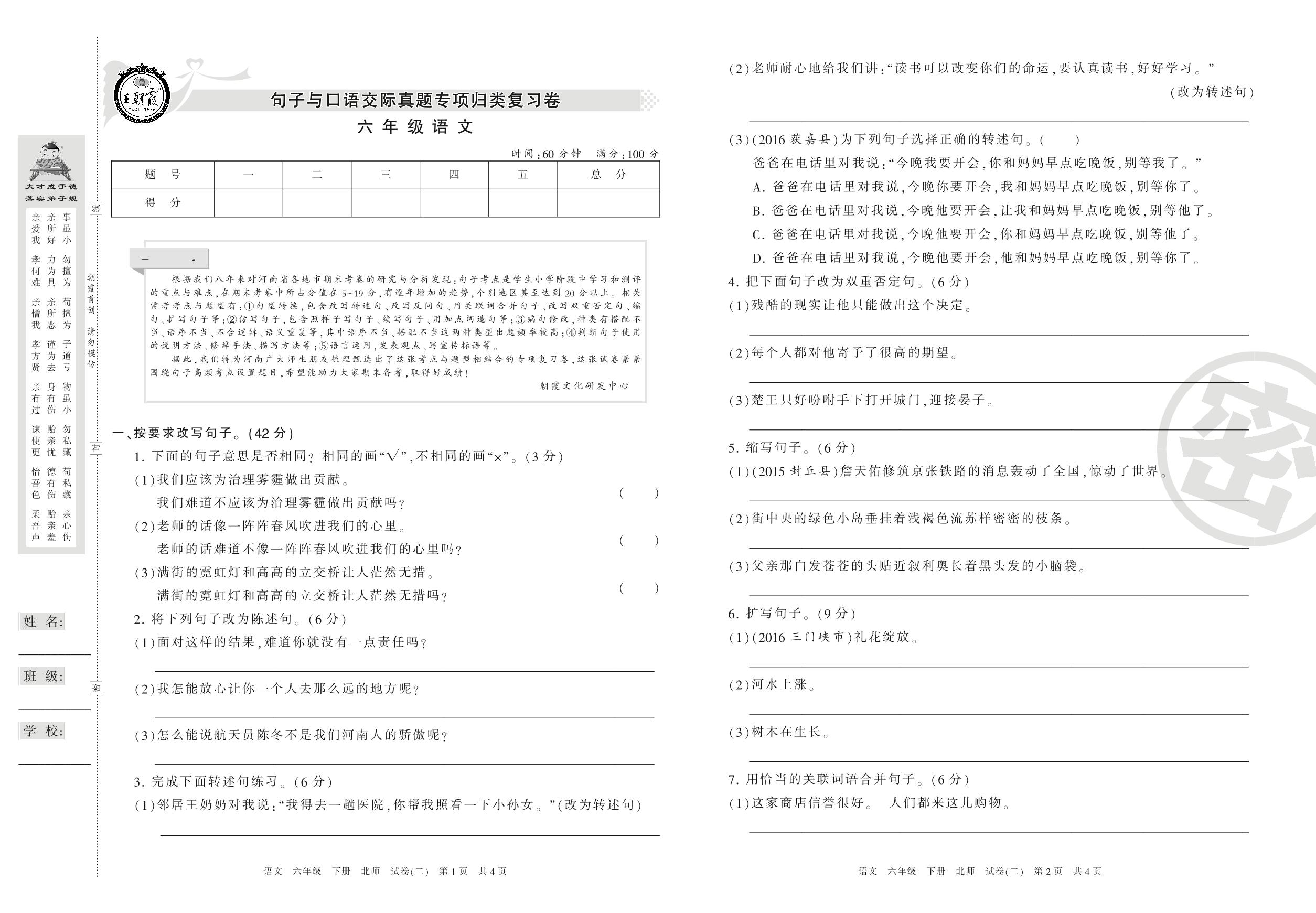 王朝霞期末专项卷六年级下册语文(北师版)_R21080244832【2】