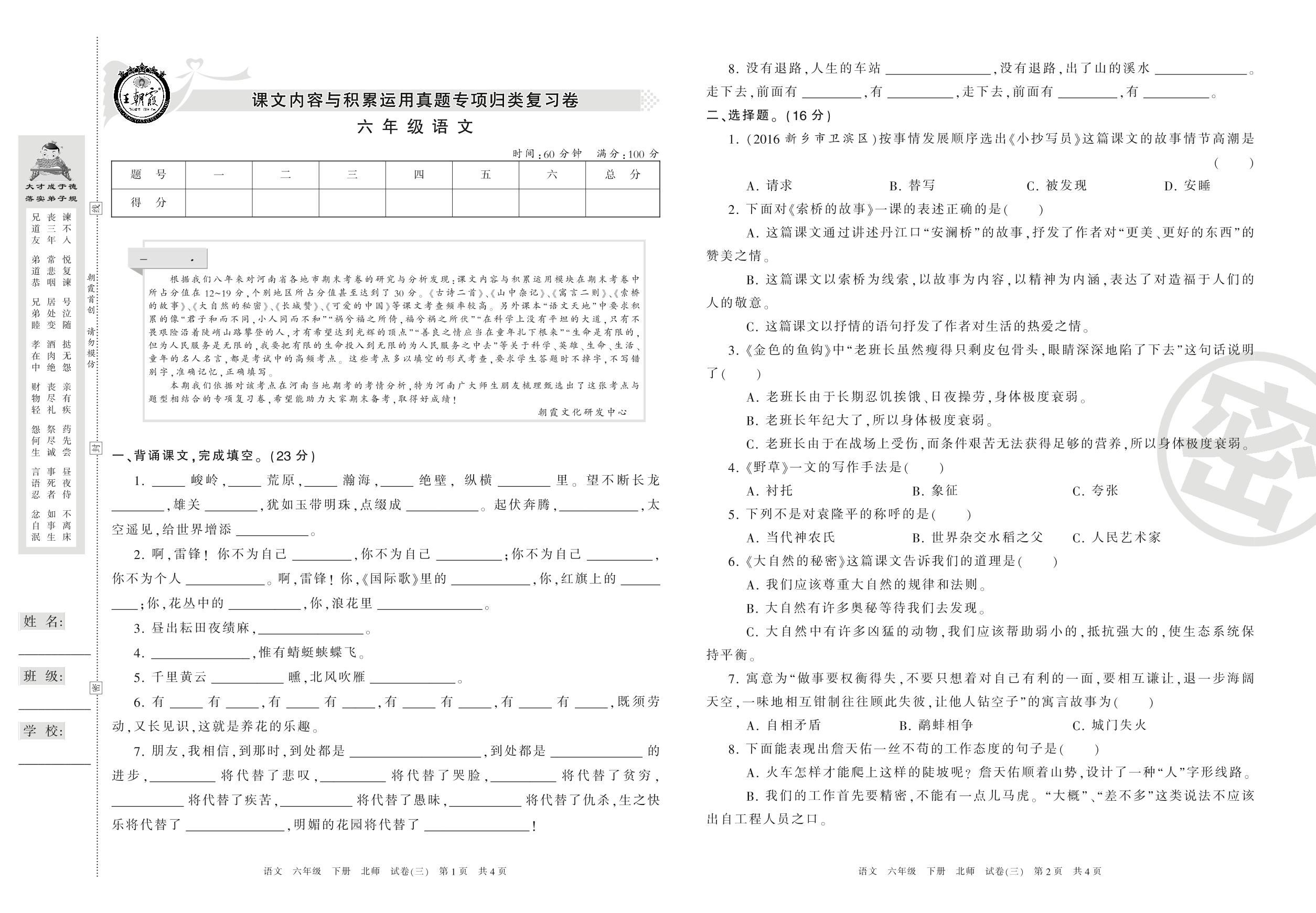 王朝霞期末专项卷六年级下册语文(北师版)_R21080244839【3】
