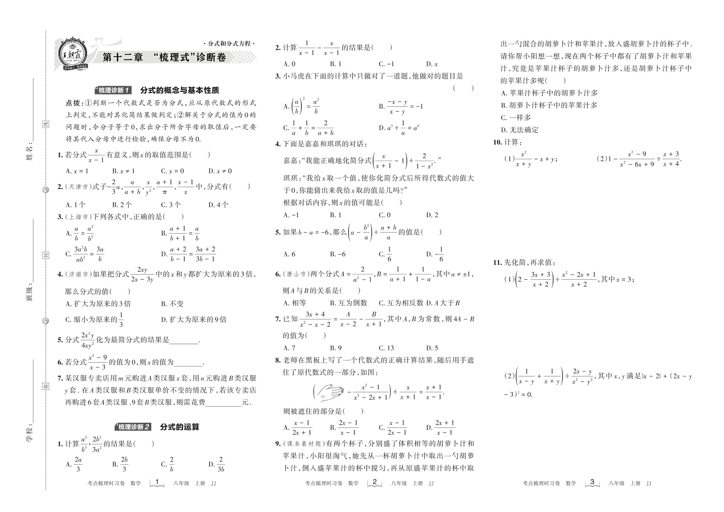 2022上册八年级数学冀教版 第十二章 “梳理式”诊断卷
