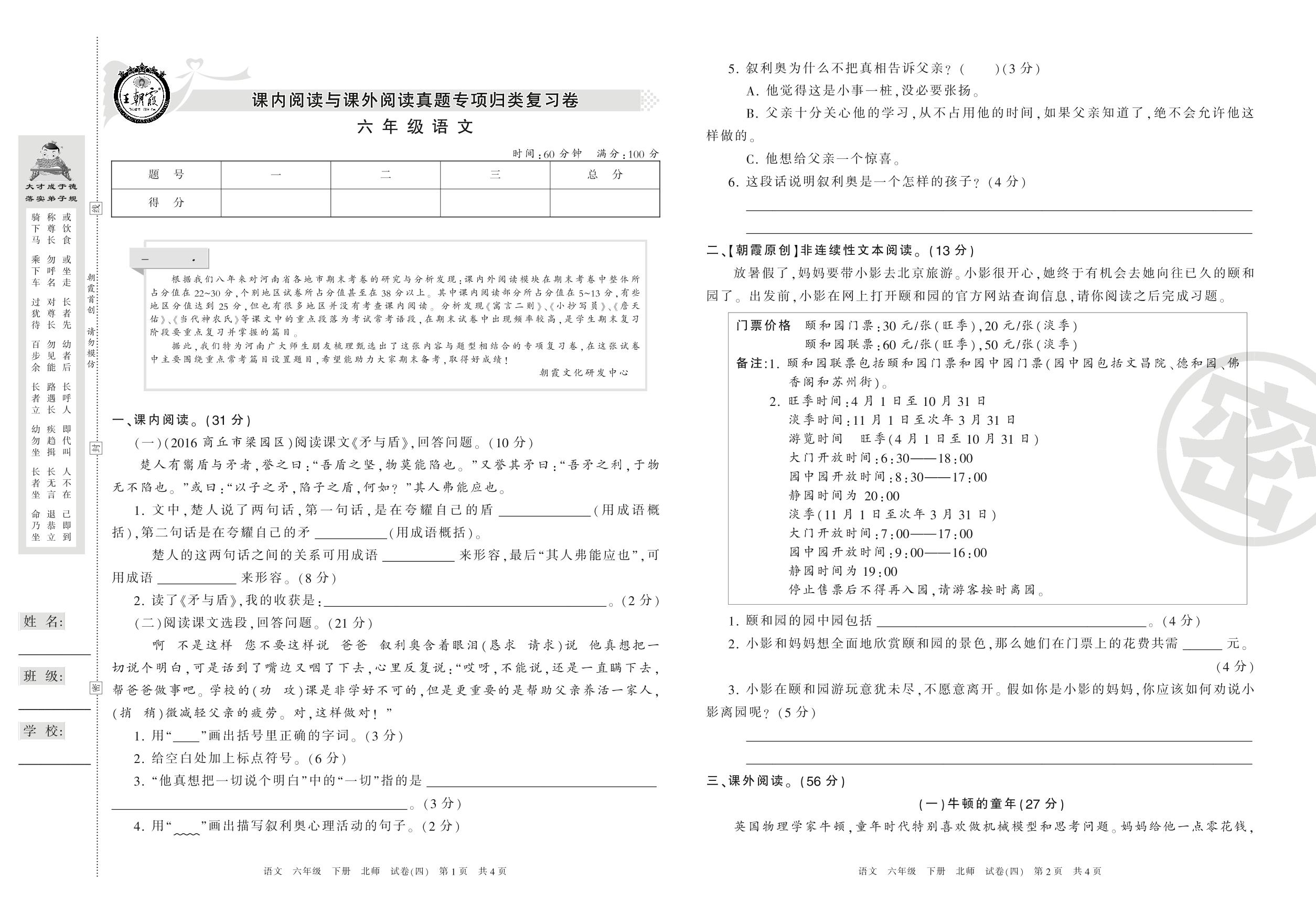 王朝霞期末专项卷六年级下册语文(北师版)_R21080244846【4】