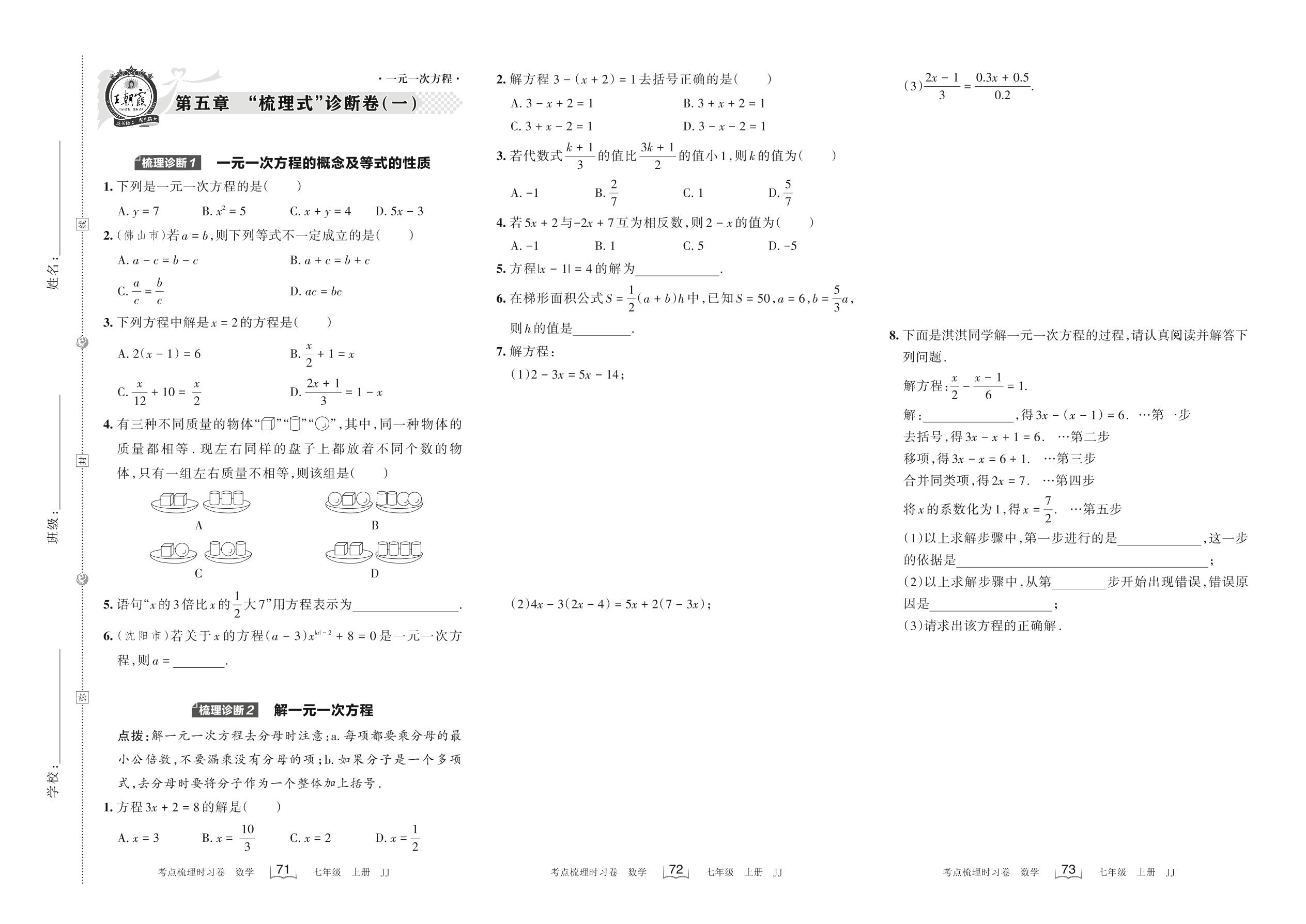 2022上册七年级数学冀教版 第五章 “梳理式”诊断卷(一)