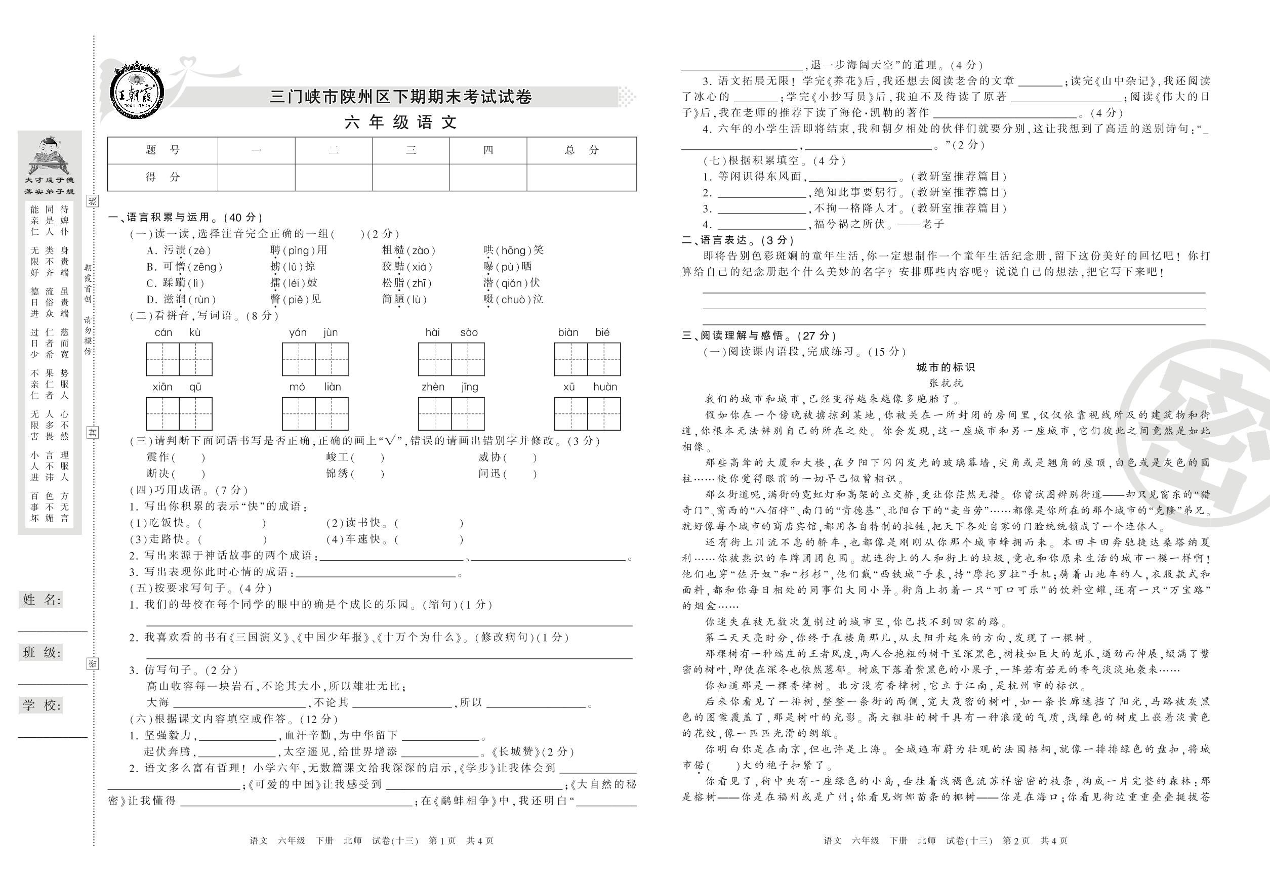 2015-2016学年第二学期三门峡市峡州区六年级语文试卷(北师版)【13】