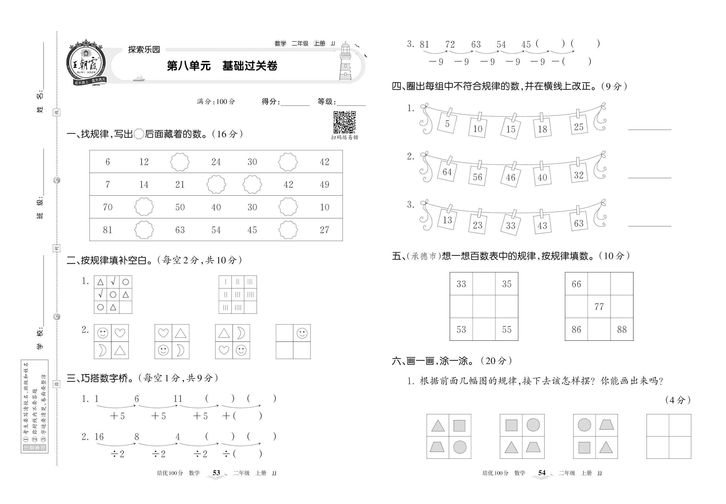 2022上册二年级数学冀教版 第八单元 基础过关卷