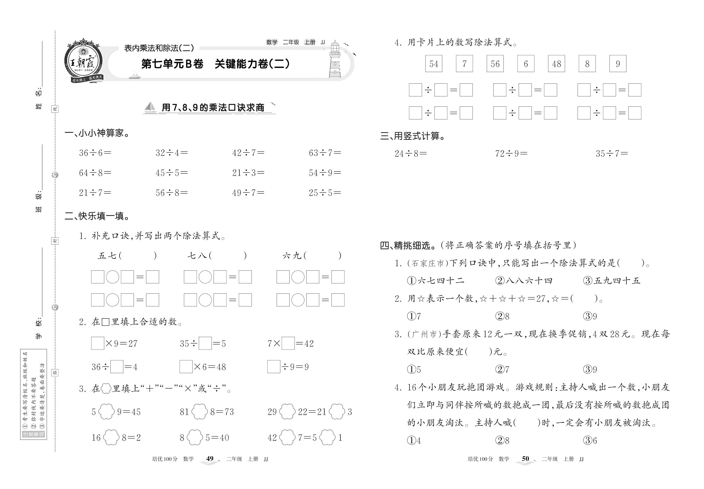 2022上册二年级数学冀教版 第七单元B卷 关键能力卷(二)