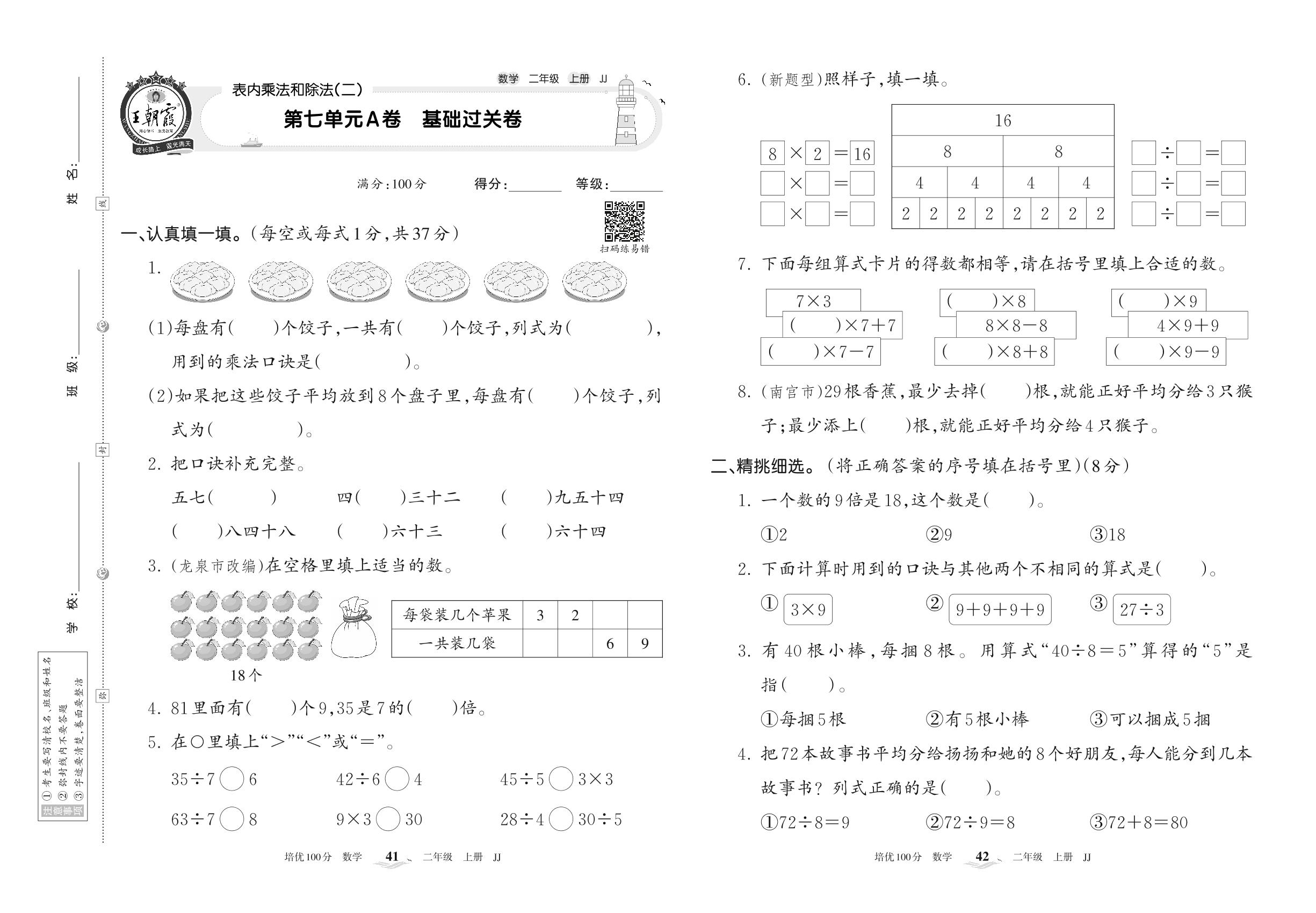 二年级数学冀教版上册单元卷