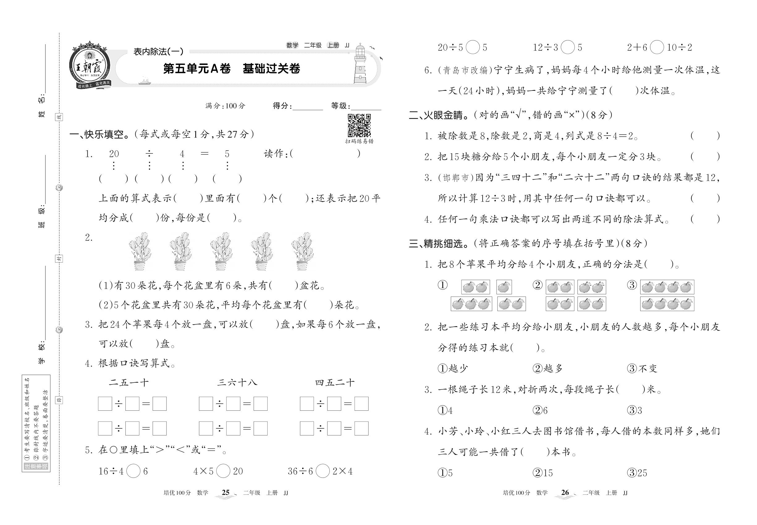 2022上册二年级数学冀教版 第五单元A卷 基础过关卷