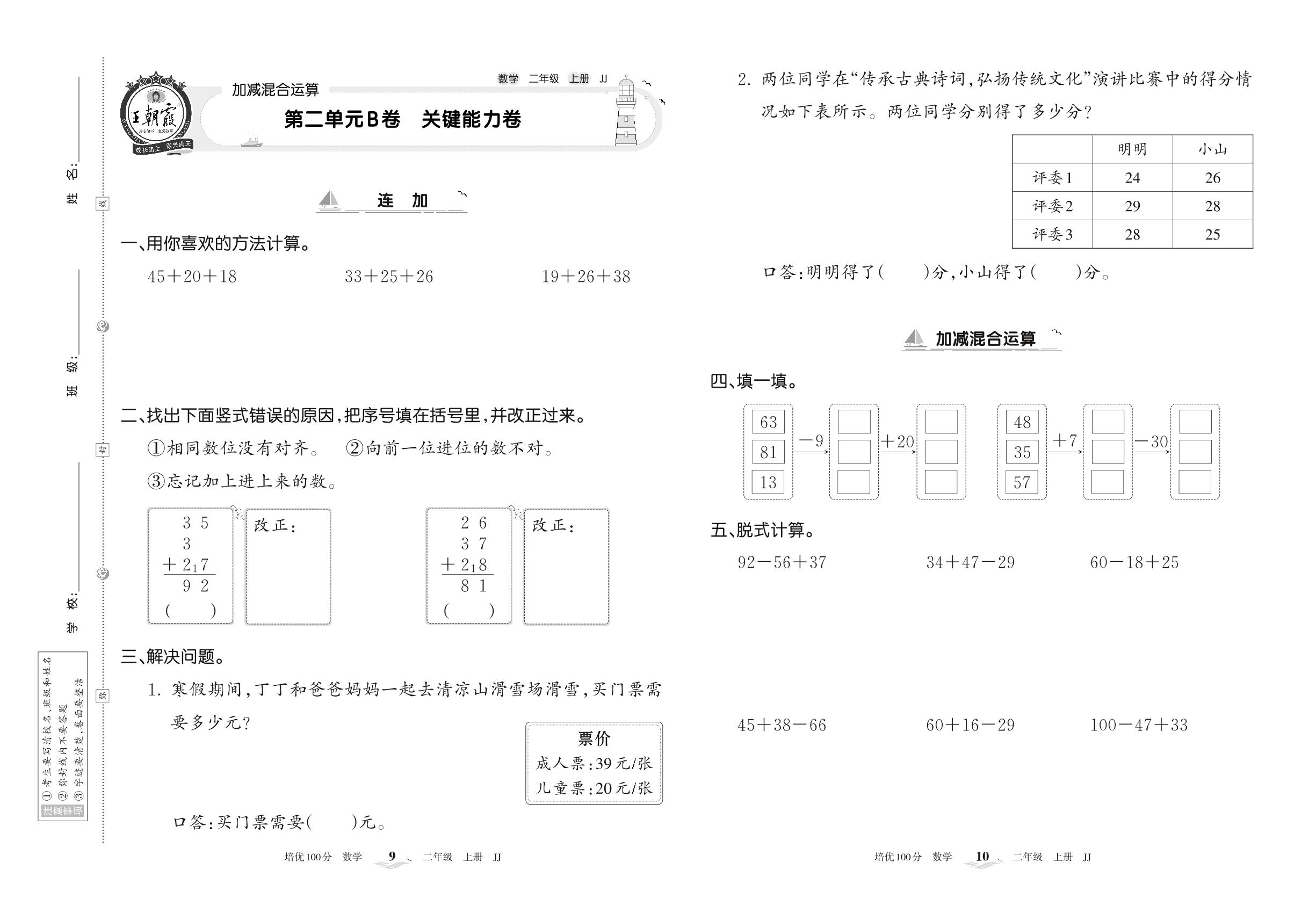 2022上册二年级数学冀教版 第二单元B卷 关键能力卷