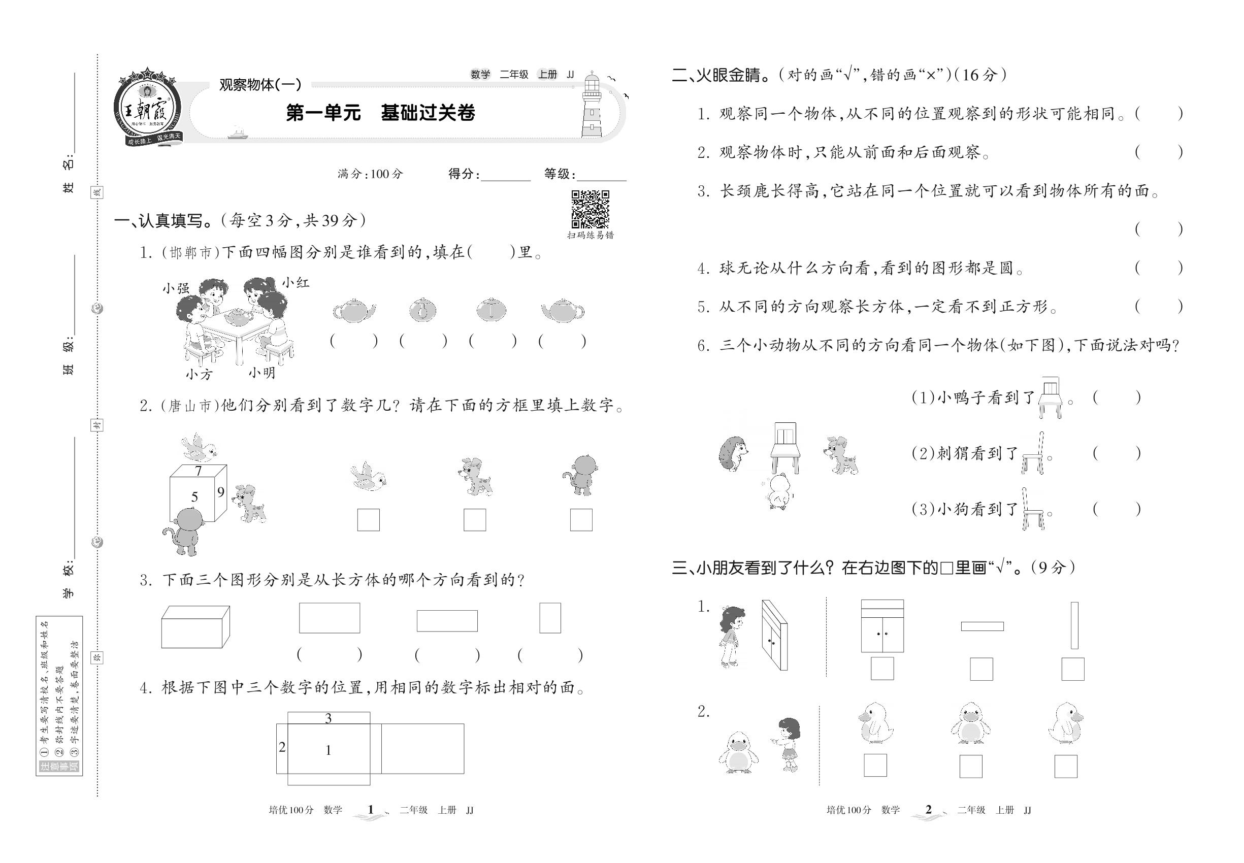 2022上册二年级数学冀教版 第一单元 基础过关卷