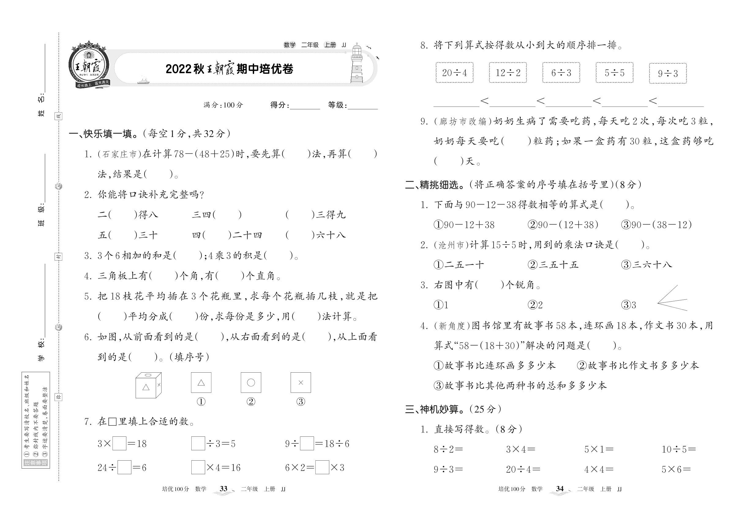 2022上册二年级数学冀教版 2022秋王朝霞期中培优卷