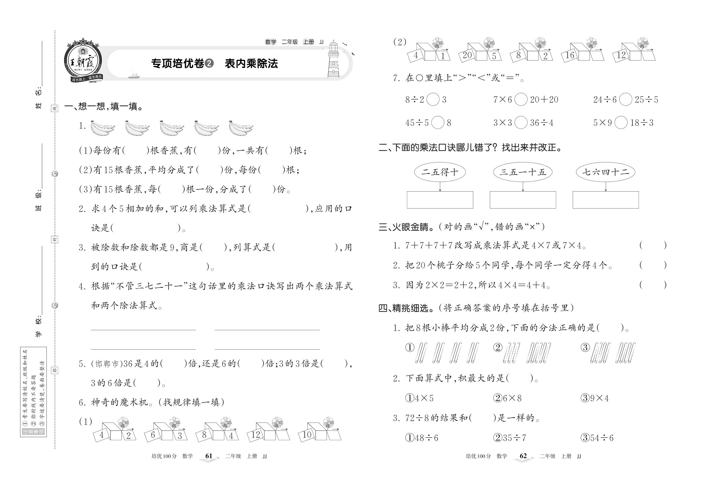 2022上册二年级数学冀教版 专项培优卷2 表内乘除法