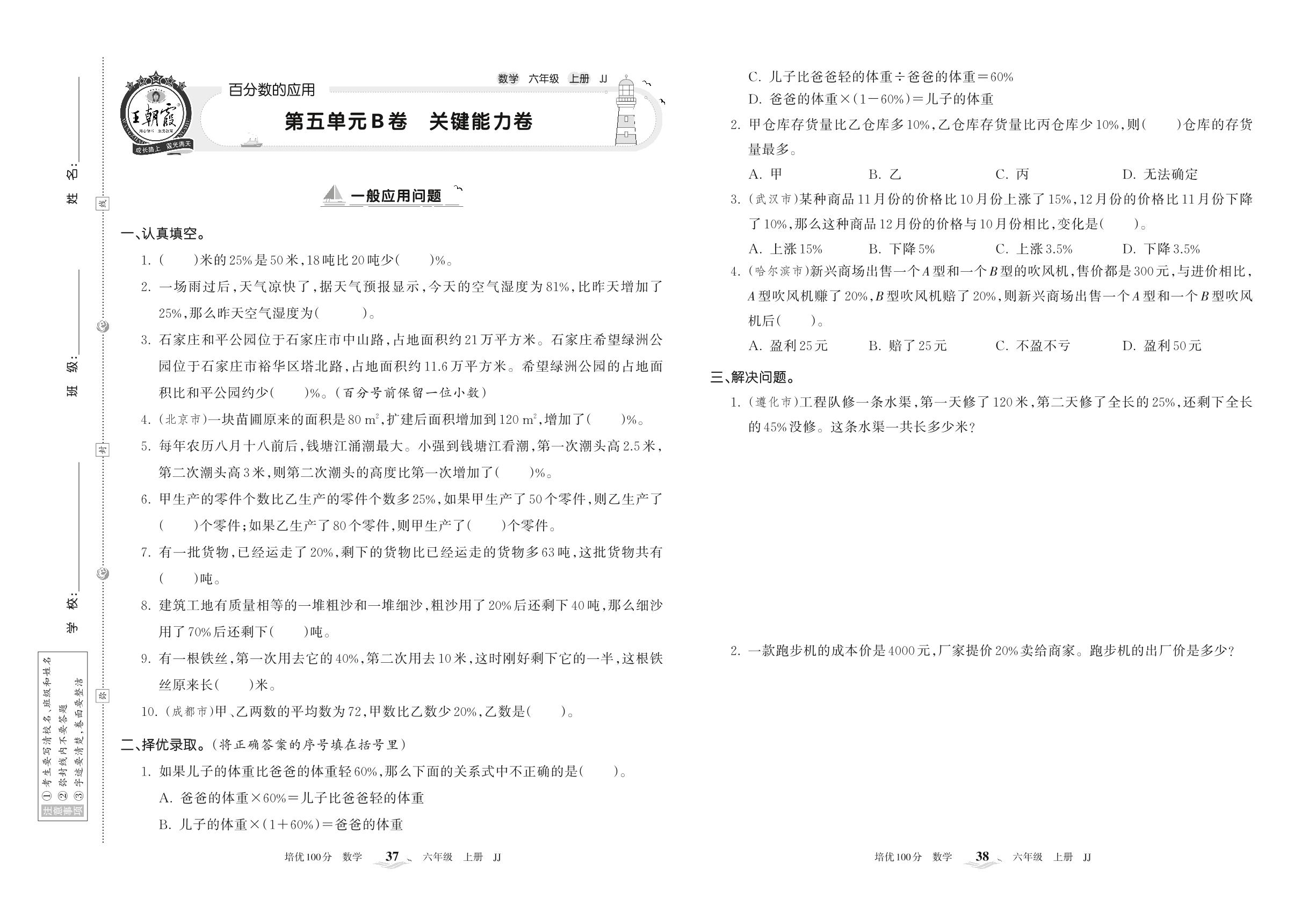 2022上册六年级数学冀教版 第五单元B卷 关键能力卷