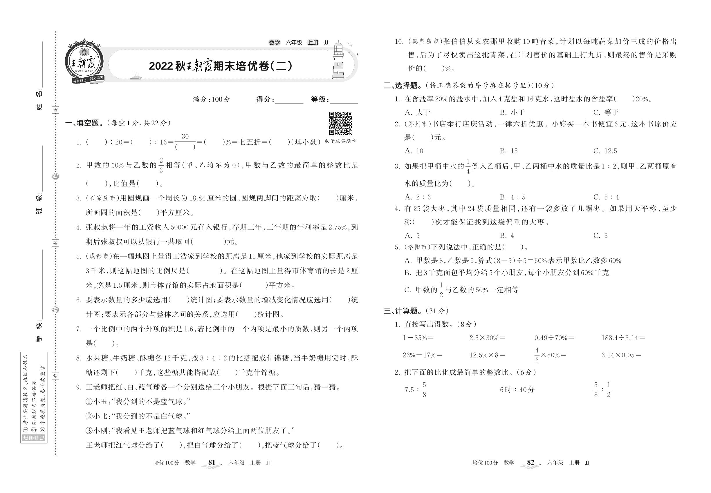 2022上册六年级数学冀教版 2022秋王朝霞期末培优卷(二)