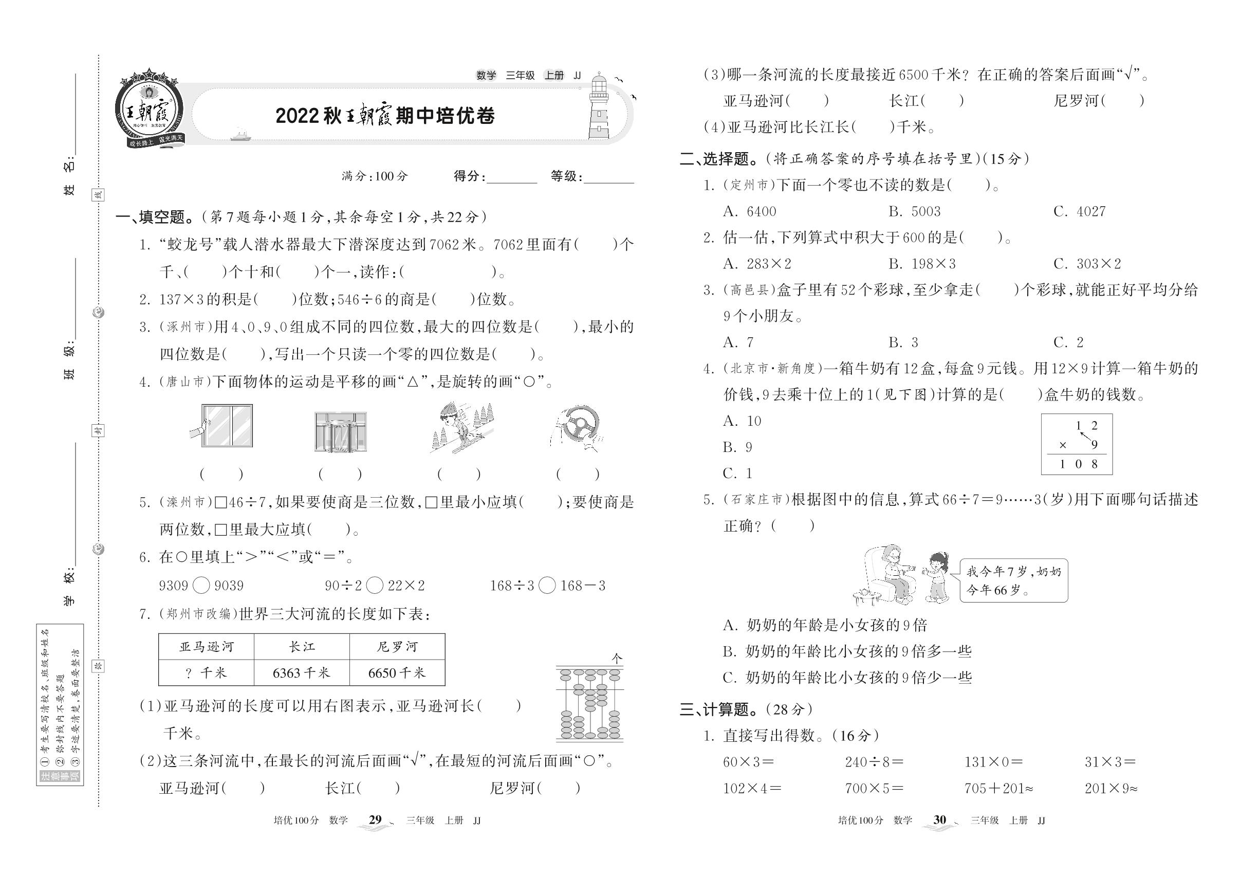 2022上册三年级数学冀教版 2022秋王朝霞期中培优卷