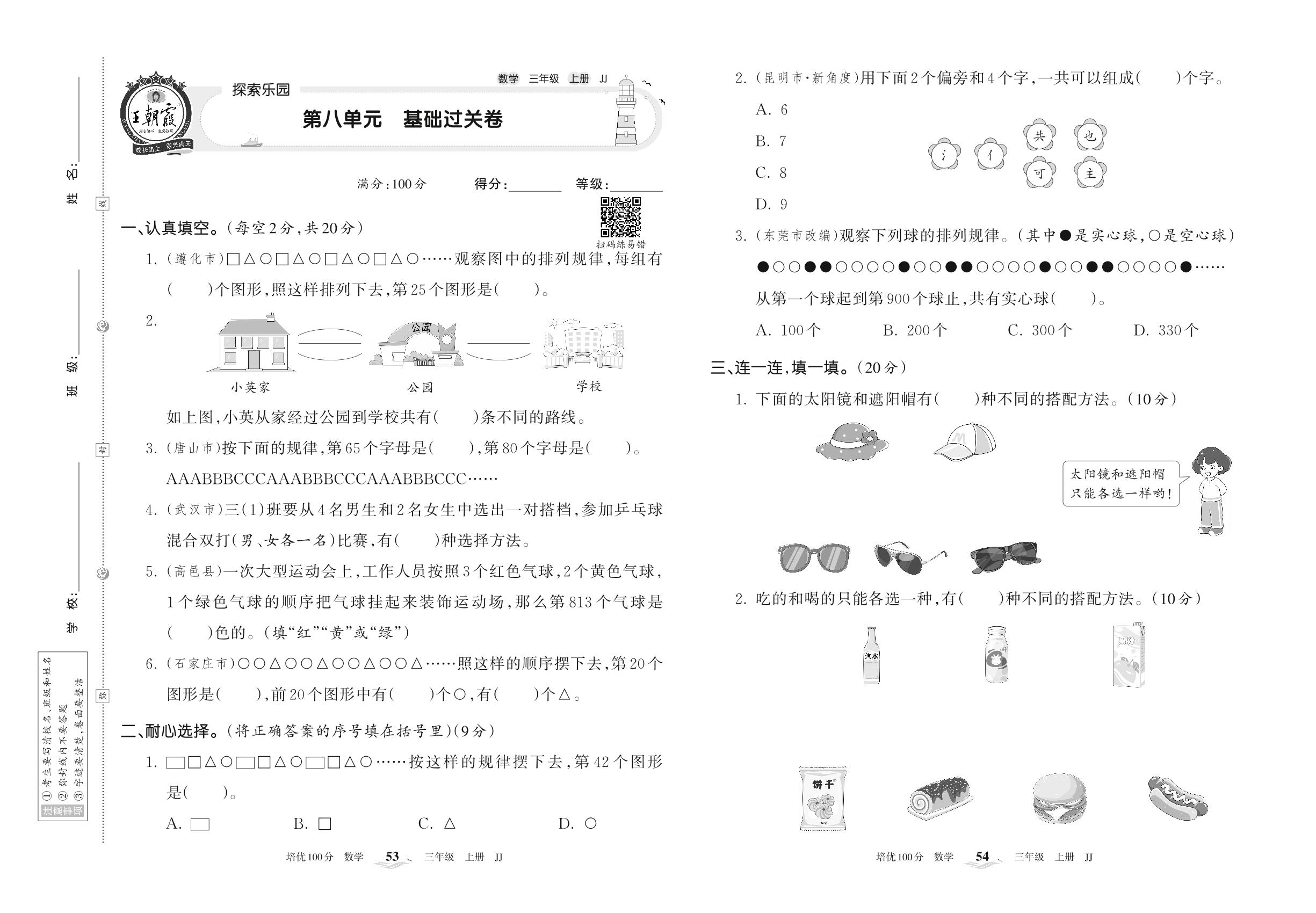 2022上册三年级数学冀教版 第八单元 基础过关卷