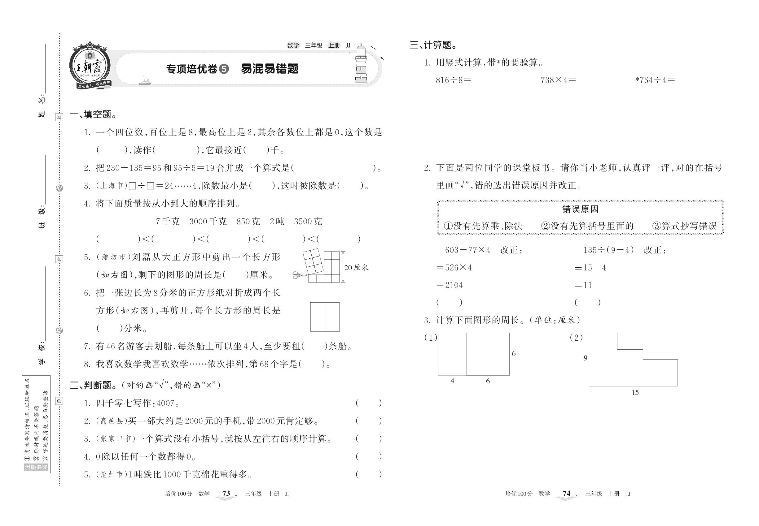 2022上册三年级数学冀教版 专项培优卷5 易混易错题