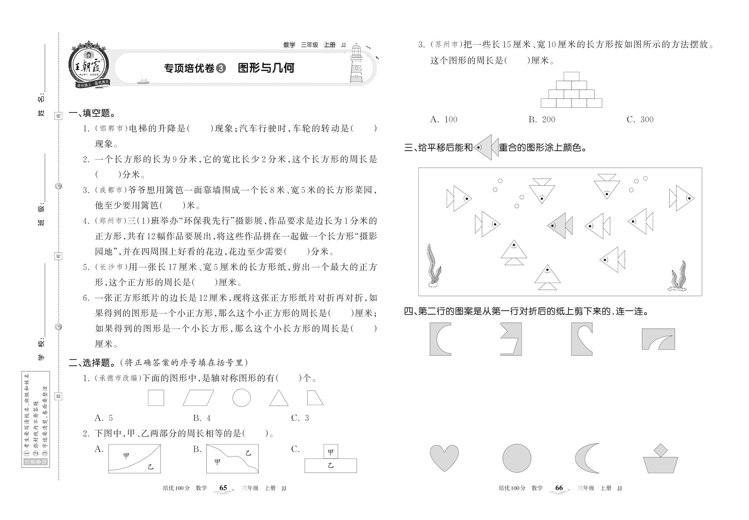 2022上册三年级数学冀教版 专项培优卷3 图形与几何