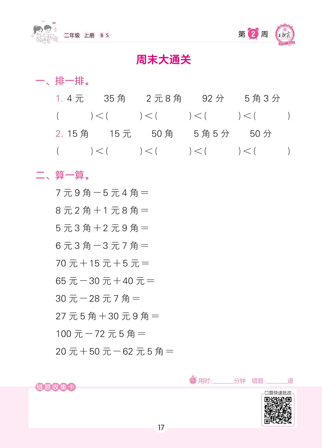 2022上册二年级数学北师版 第2周 周末大通关