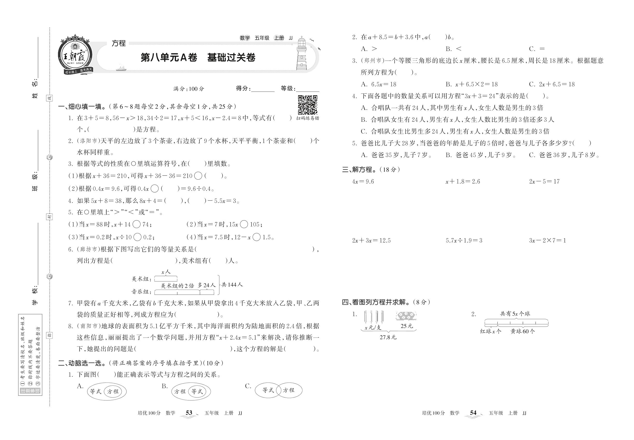 2022上册五年级数学冀教版 第八单元A卷 基础过关卷