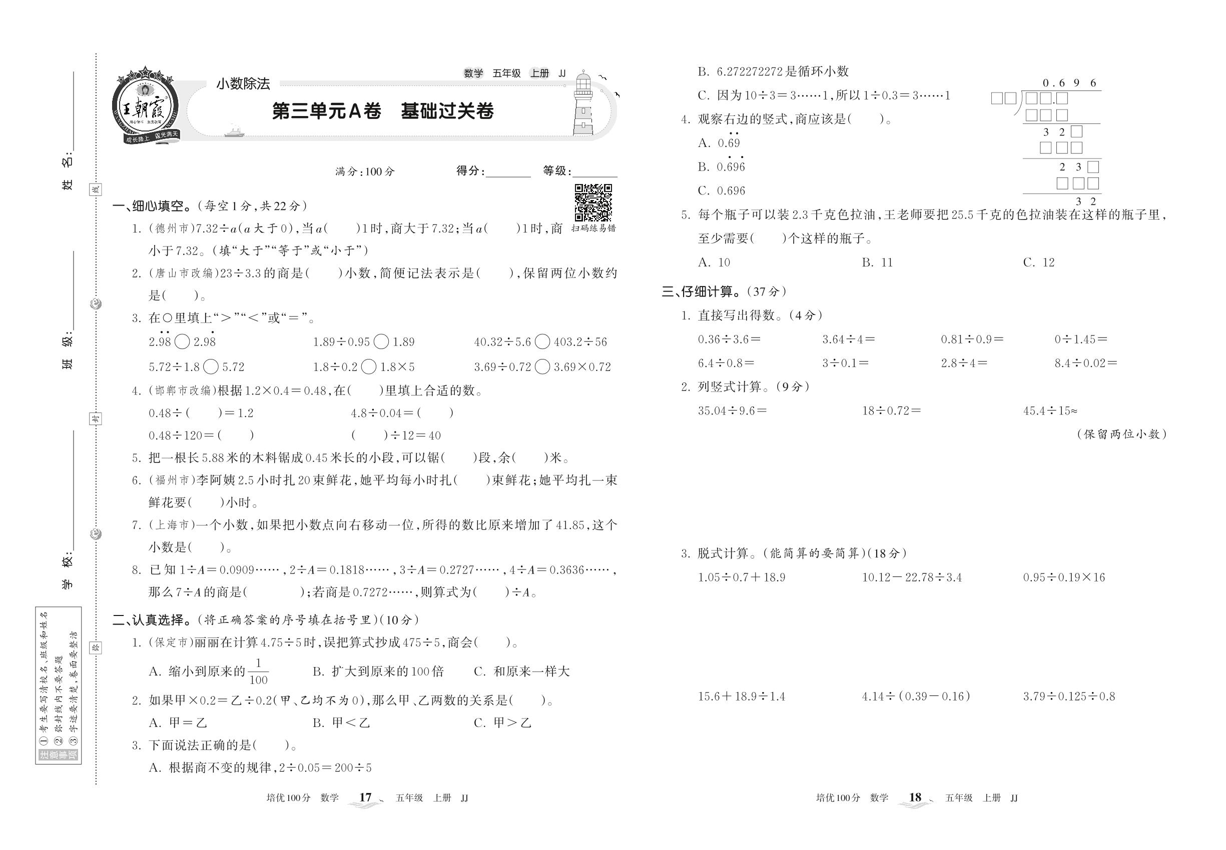 2022上册五年级数学冀教版 第三单元A卷 基础过关卷