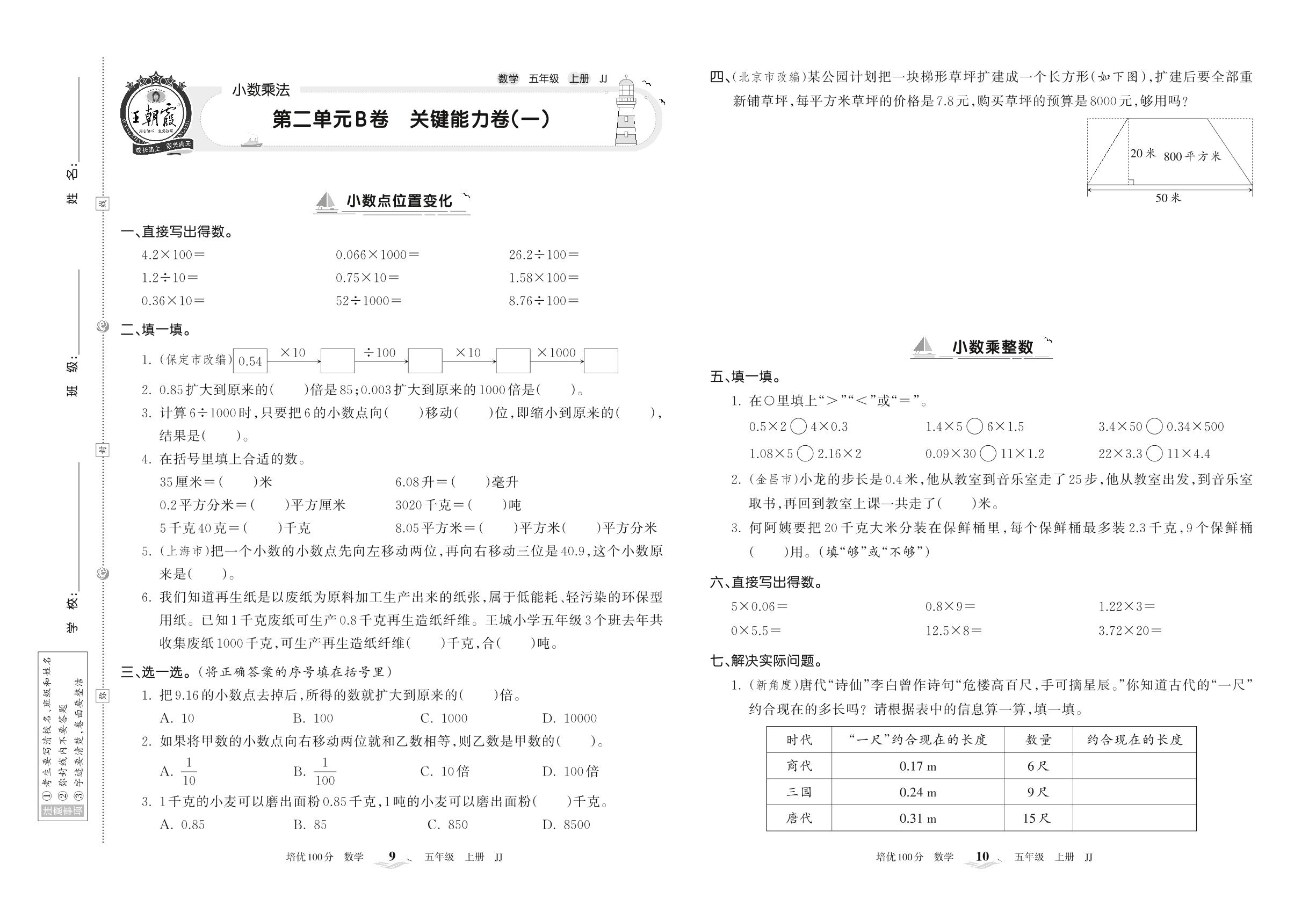 2022上册五年级数学冀教版 第二单元B卷 关键能力卷(一)