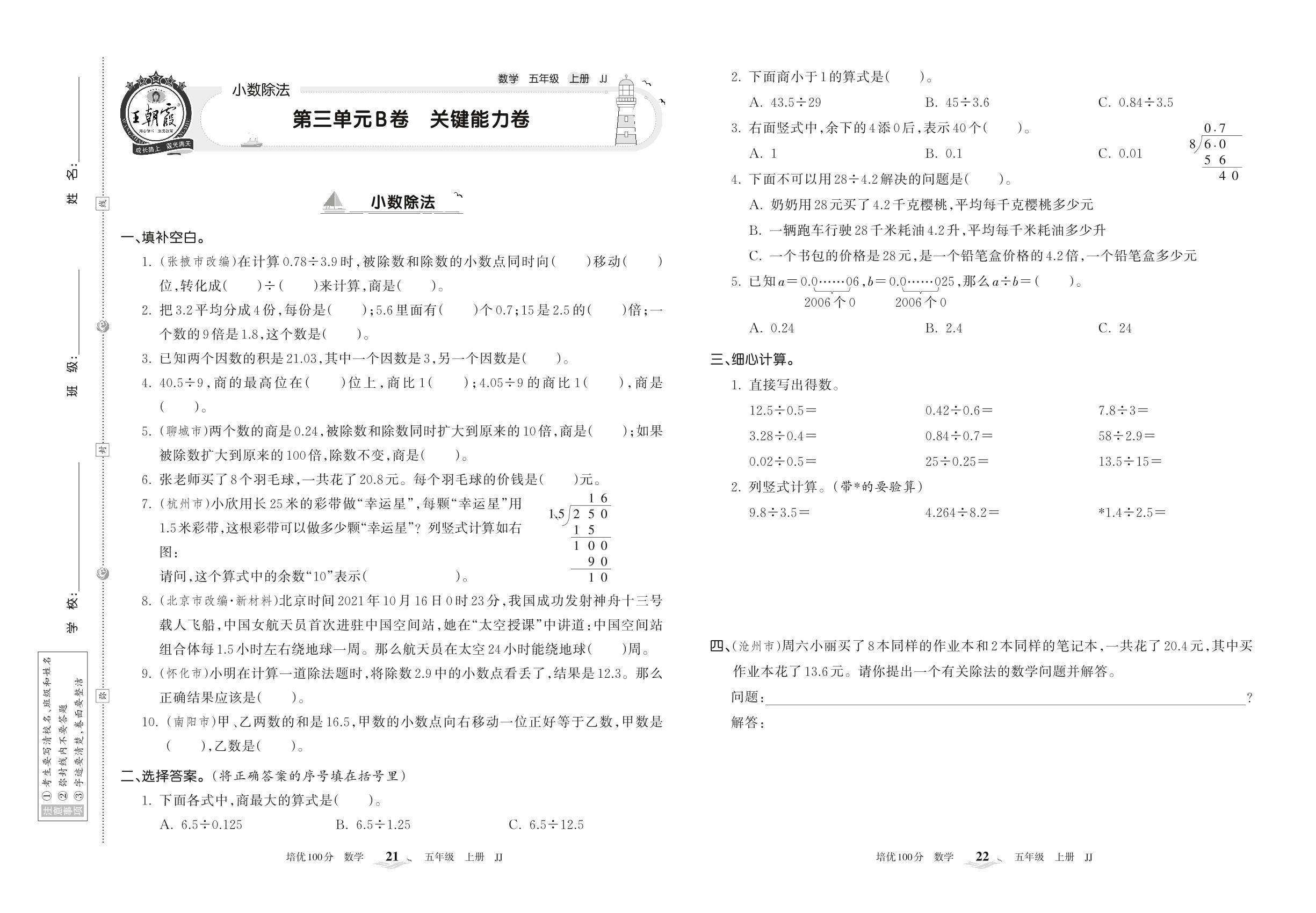 2022上册五年级数学冀教版 第三单元B卷 关键能力卷