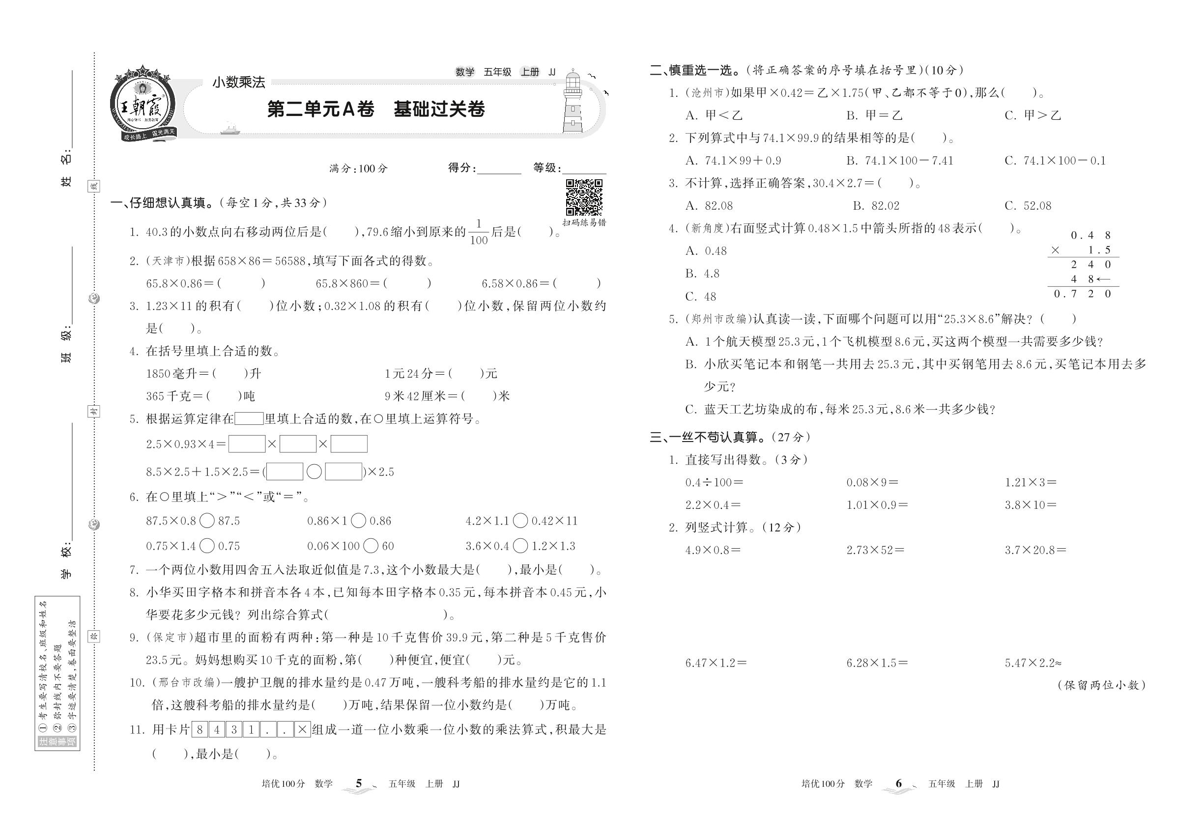 2022上册五年级数学冀教版 第二单元A卷 基础过关卷