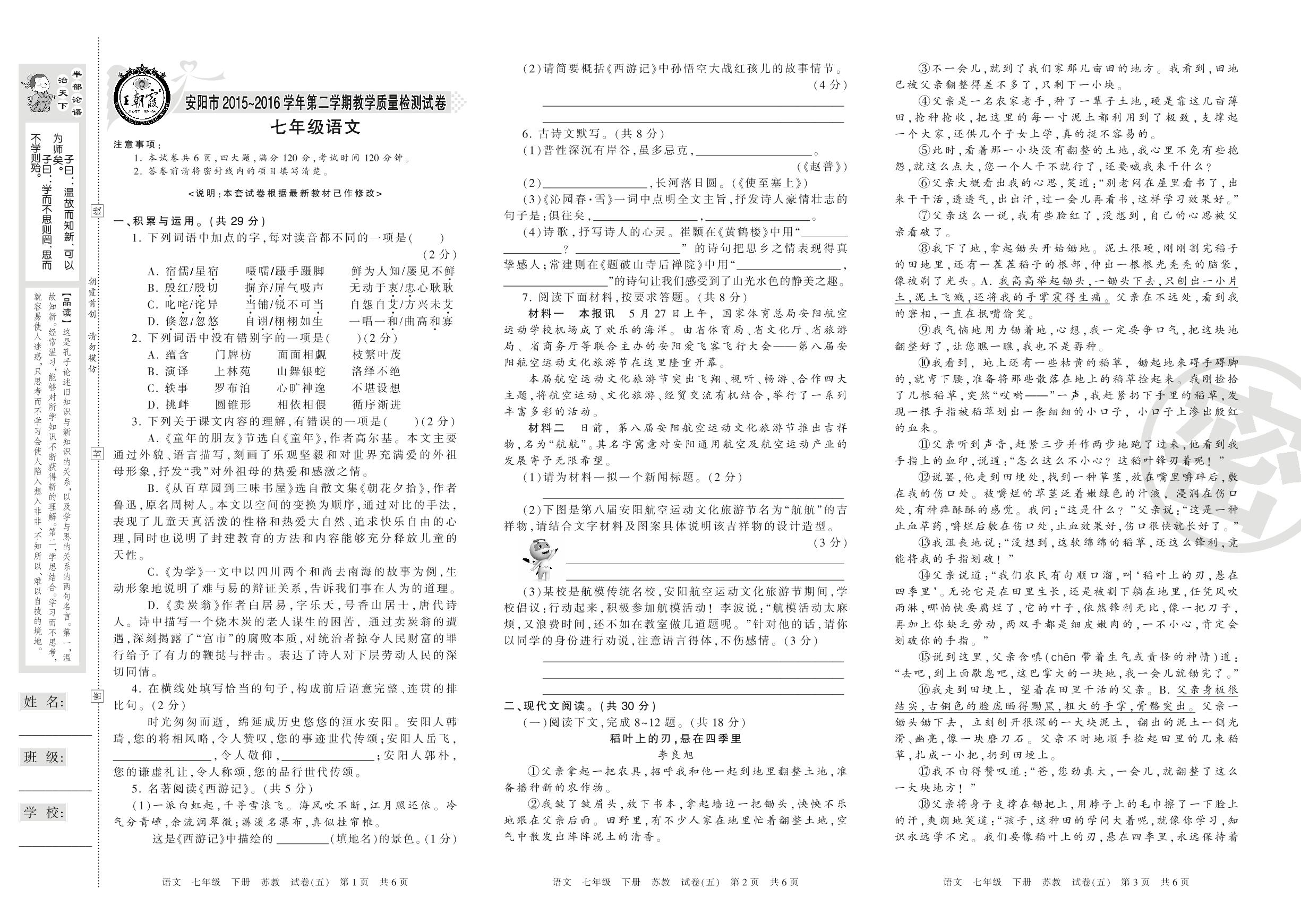 2015-2016学年第二学期安阳市七年级语文试卷(苏教版)【5】