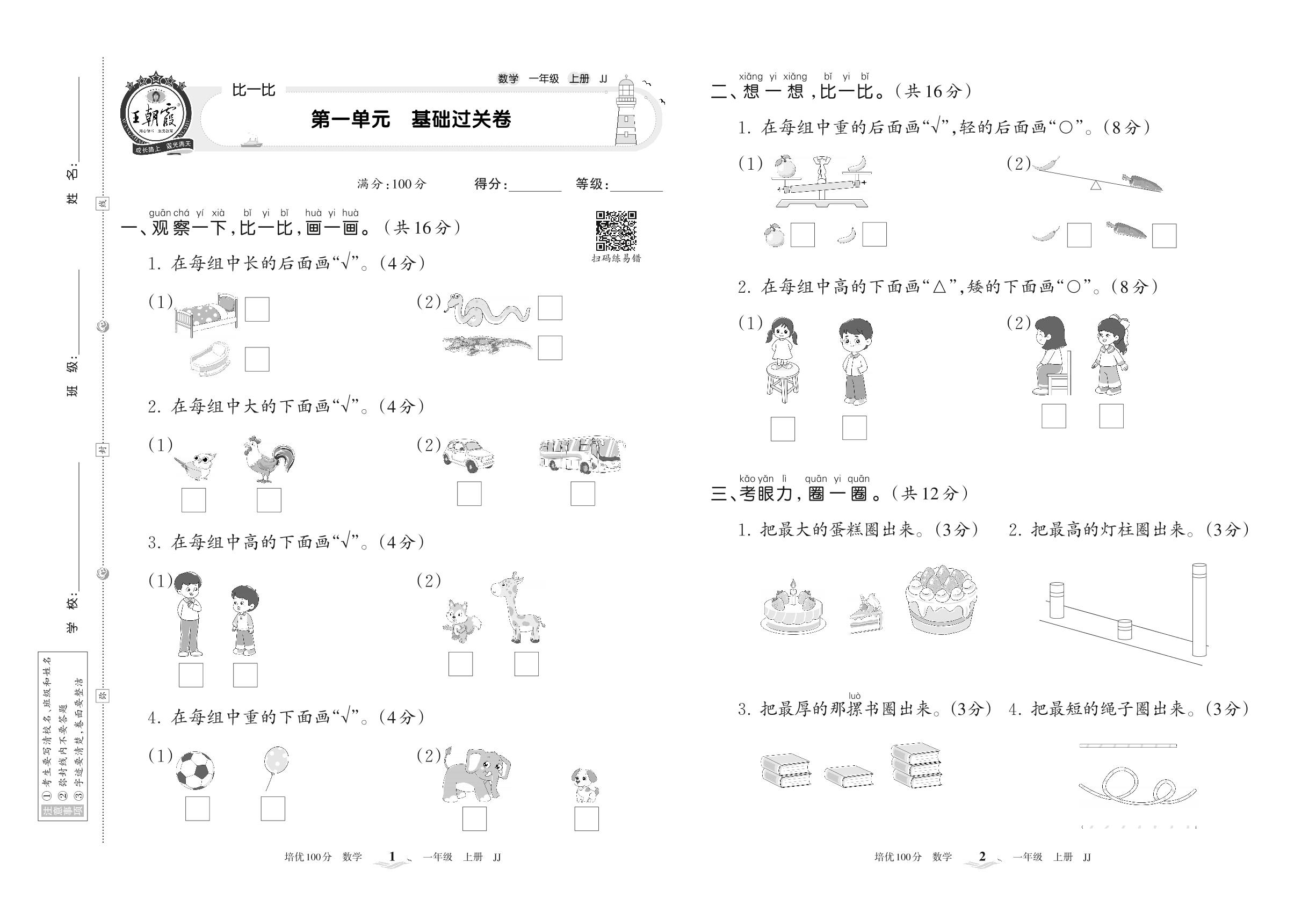 2022上册一年级数学冀教版 第一单元 基础过关卷