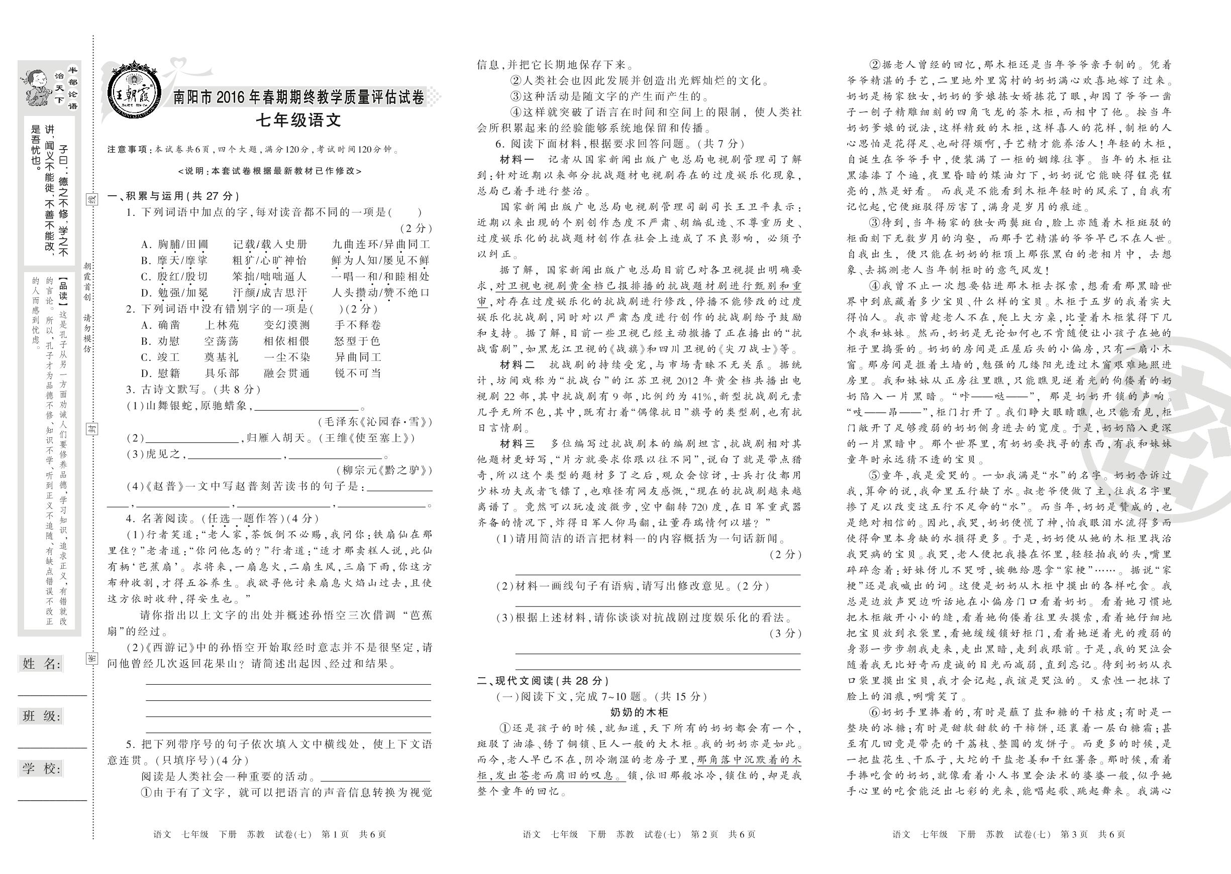 2015-2016学年第二学期南阳市七年级语文试卷(苏教版)【7】
