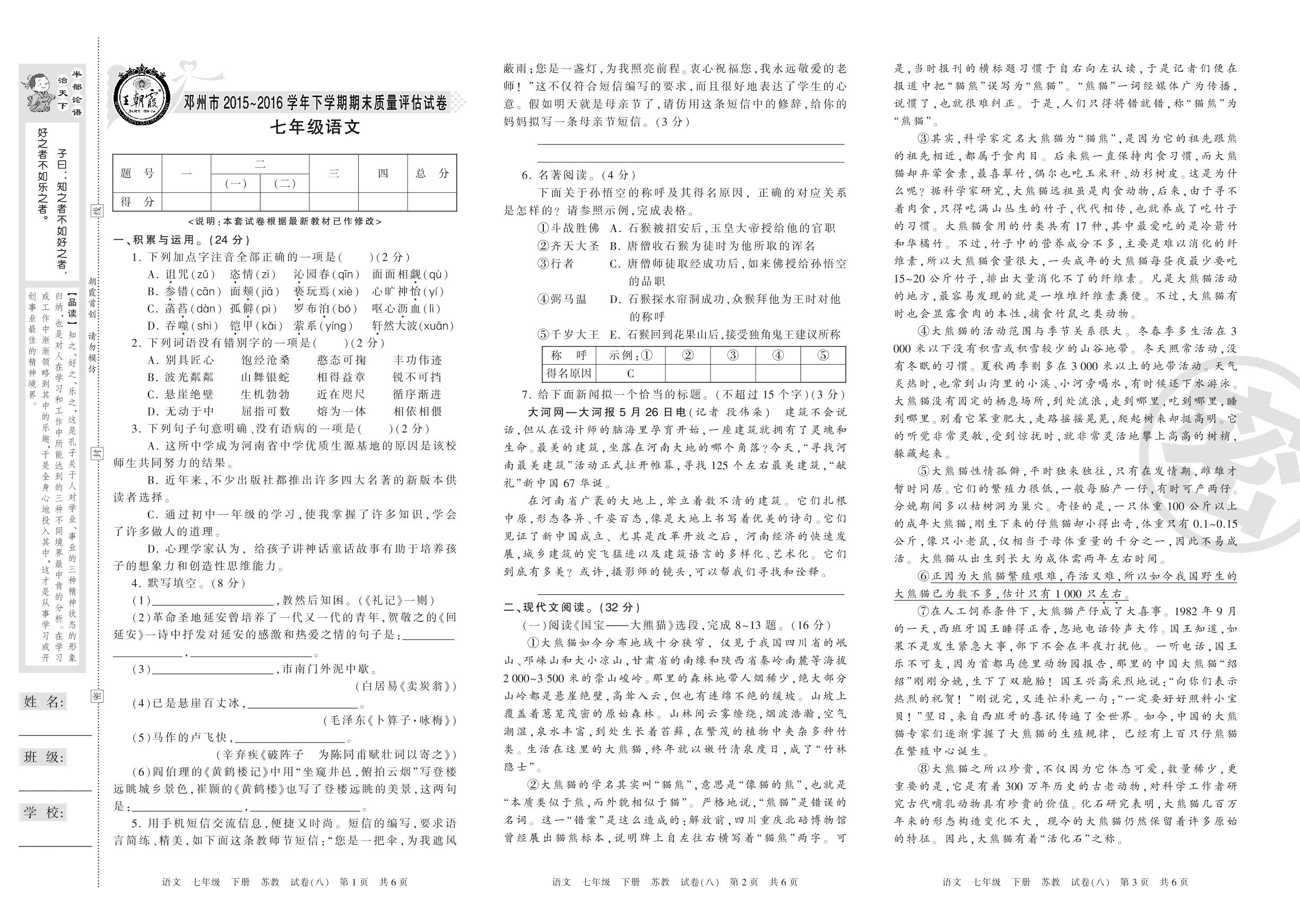 2015-2016学年第二学期邓州市七年级语文试卷(苏教版)【8】