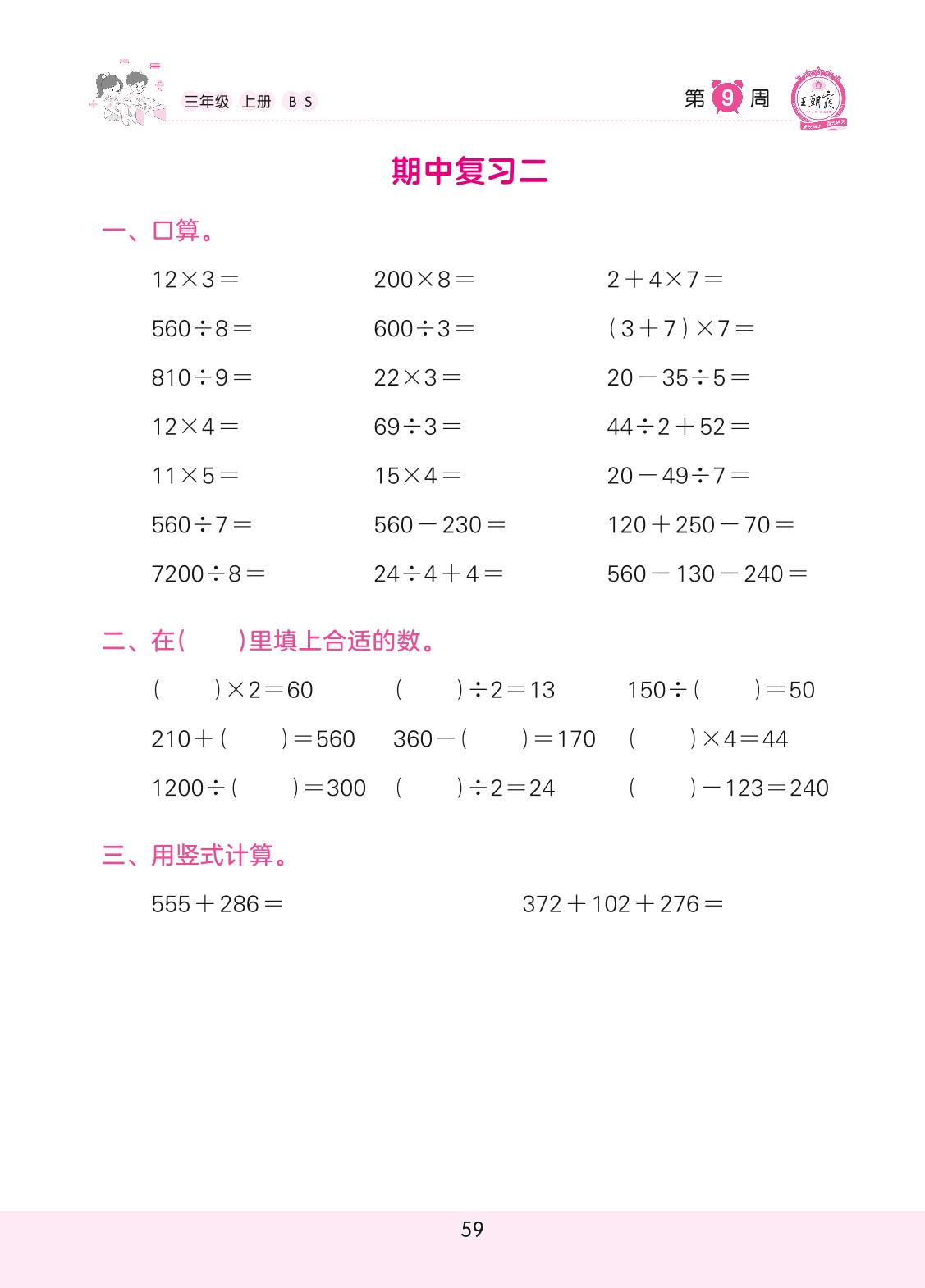 2022上册三年级数学北师版 第9周 期中复习二(计算专练)
