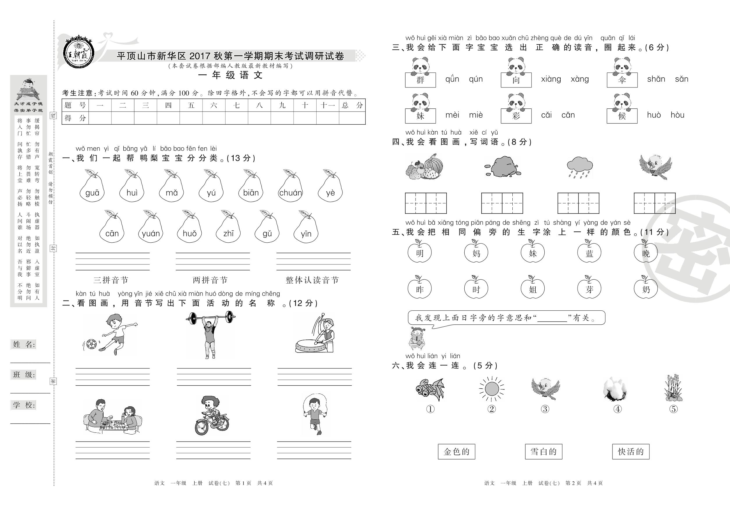 2016-2017学年第一学期平顶山市新华区一年级语文试卷(人教版)【7】