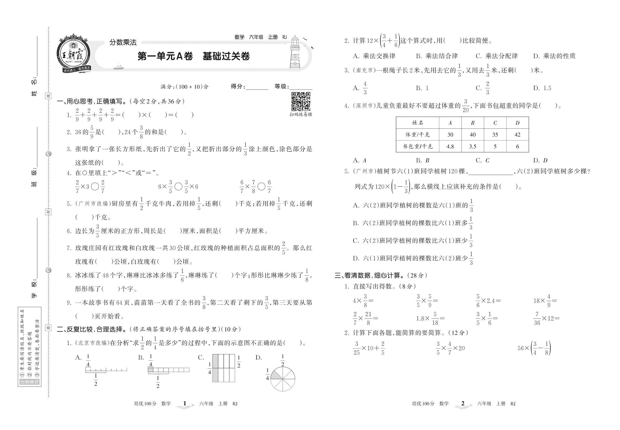2022上册六年级数学人教版 第一单元A卷 基础过关卷