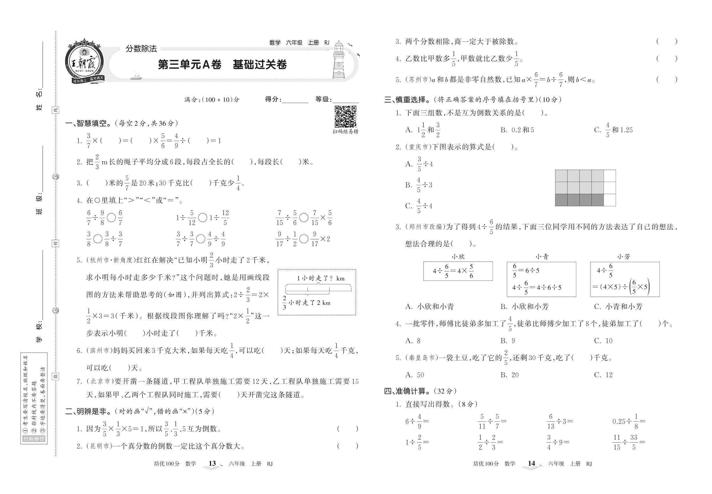 2022上册六年级数学人教版 第三单元A卷 基础过关卷