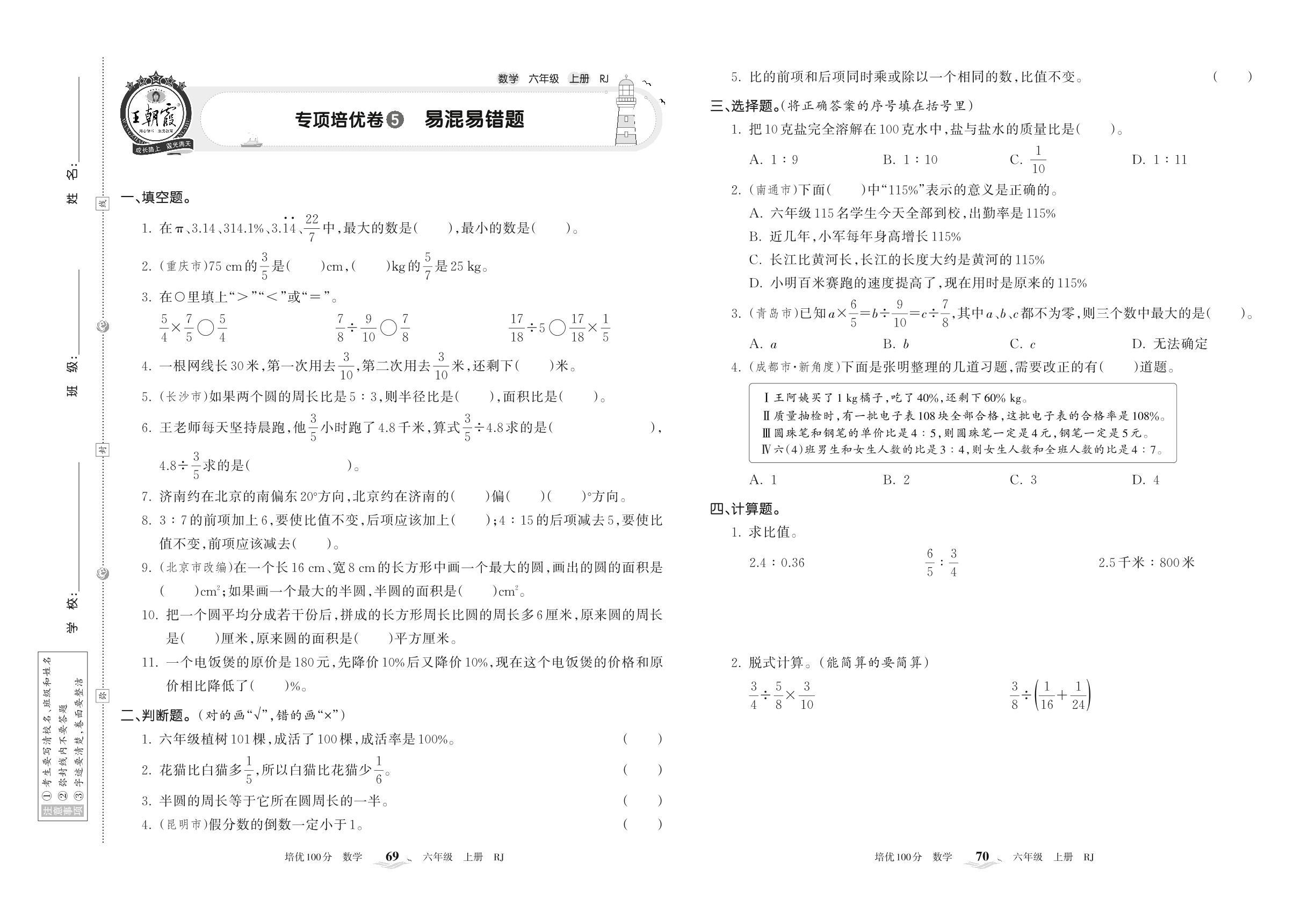 2022上册六年级数学人教版 专项培优卷5 易混易错题
