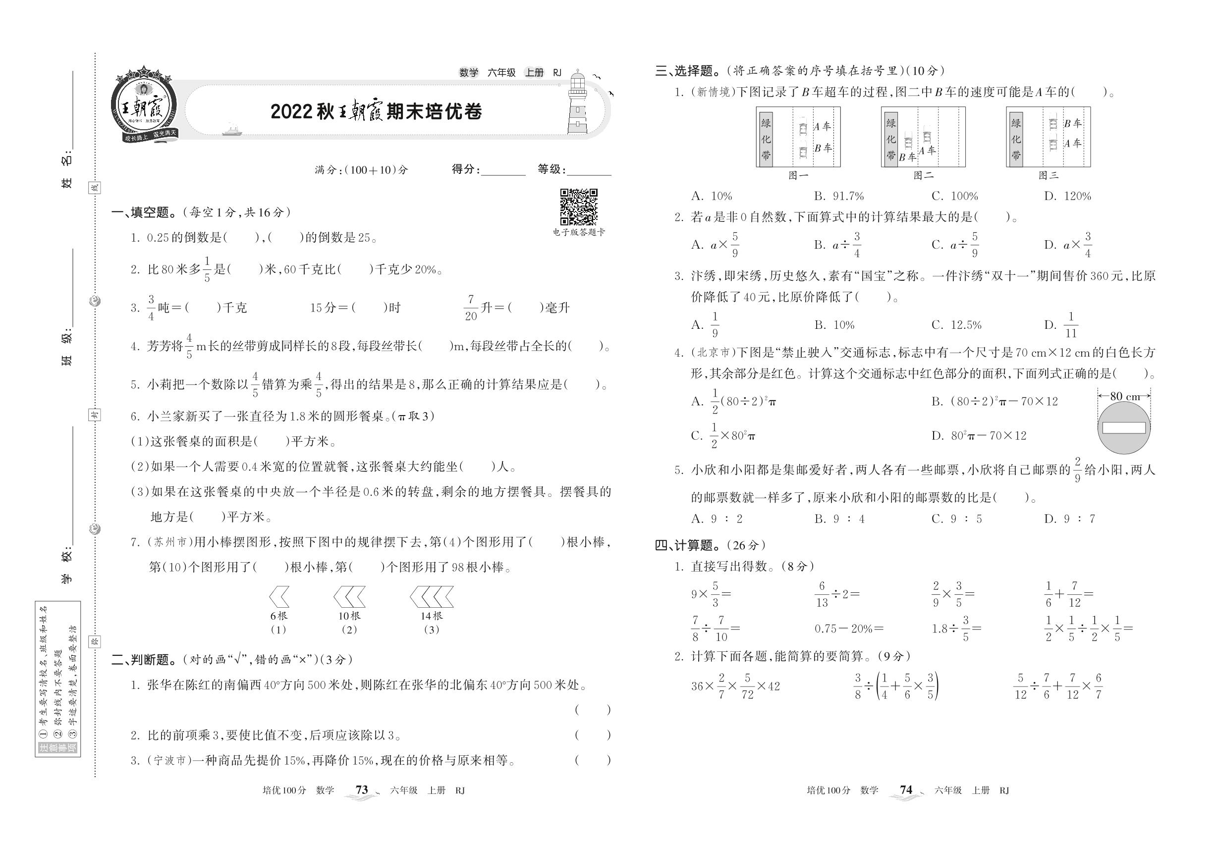 2022上册六年级数学人教版 2022秋王朝霞期末培优卷