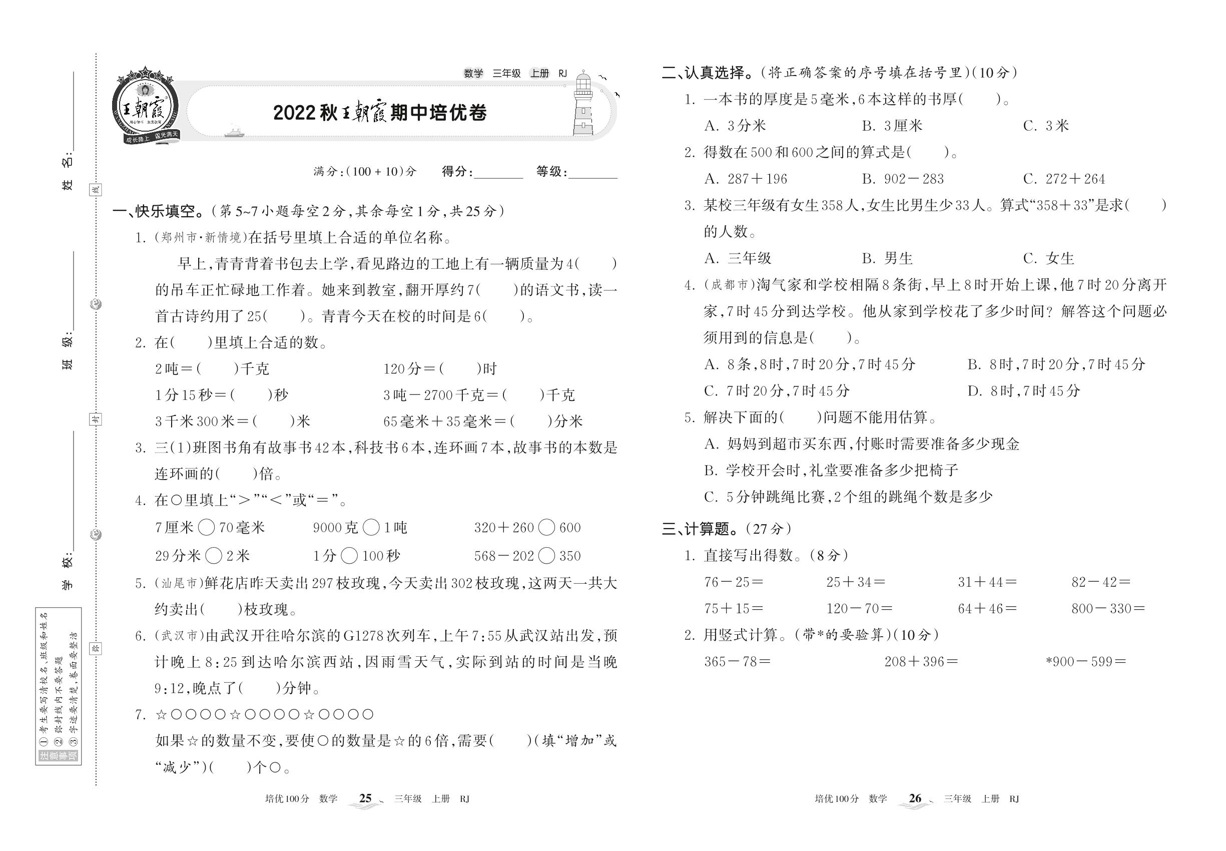 2022上册三年级数学人教版 2022秋王朝霞期中培优卷