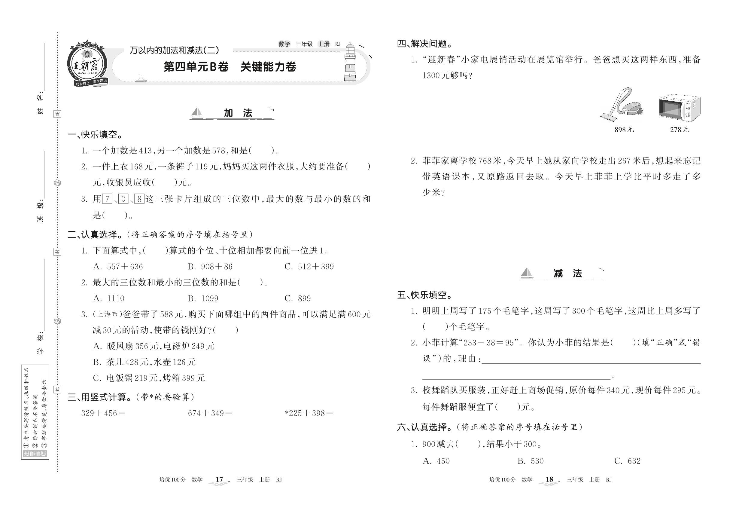 2022上册三年级数学人教版 第四单元B卷 关键能力卷