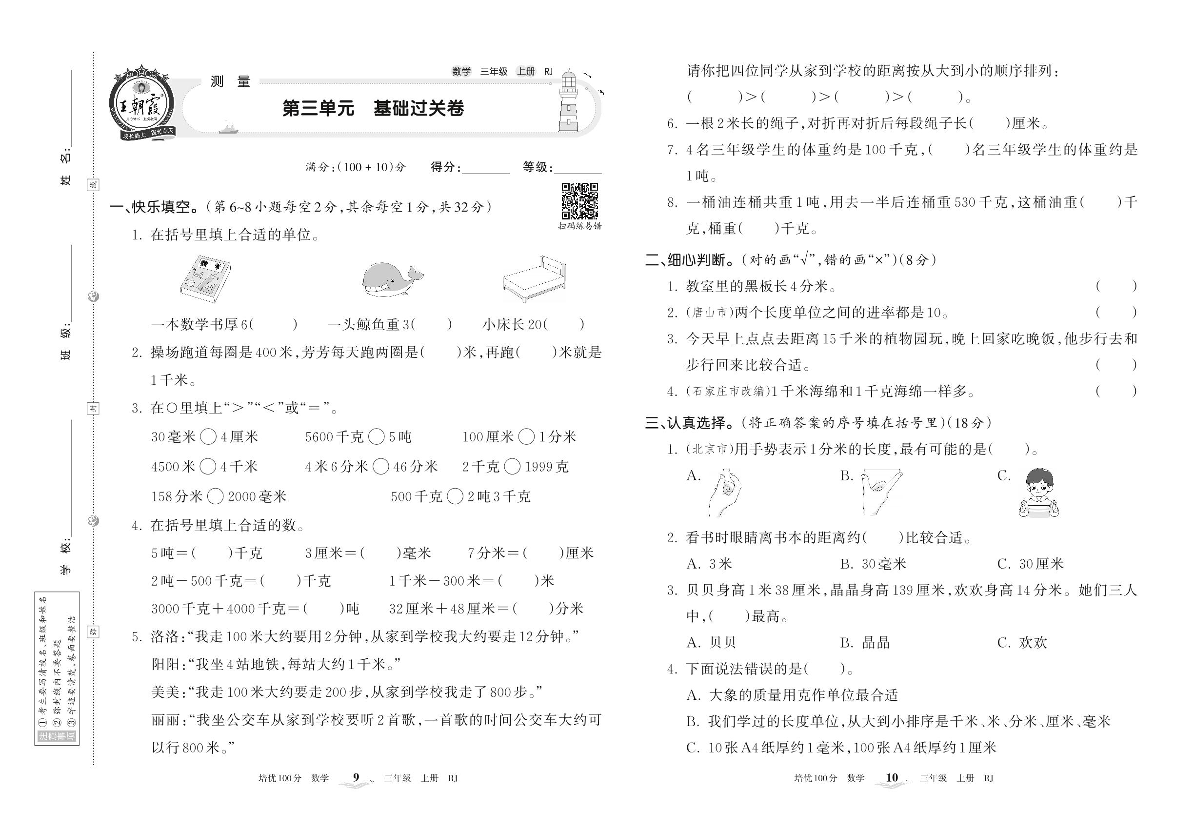 2022上册三年级数学人教版 第三单元 基础过关卷