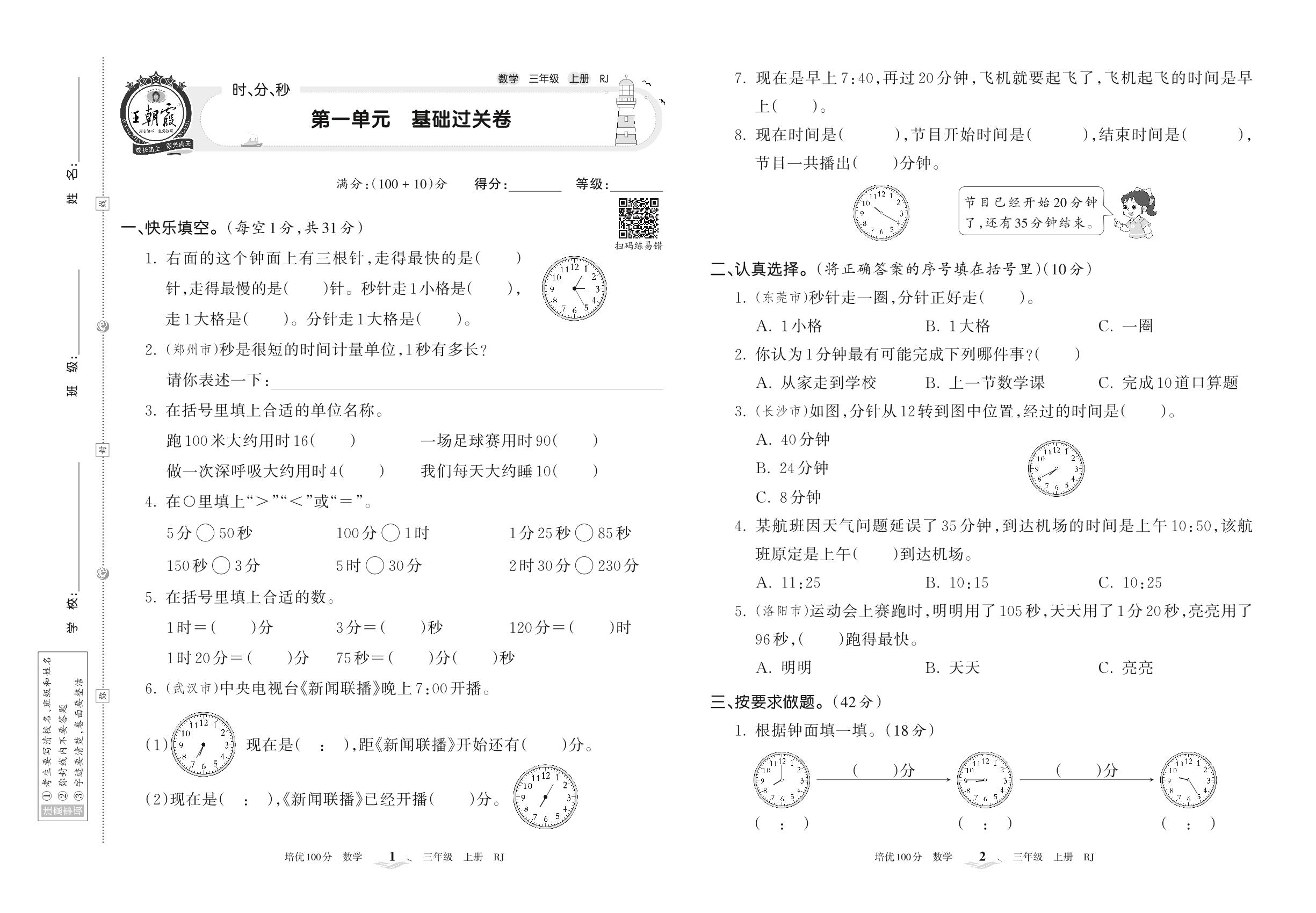 2022上册三年级数学人教版 第一单元 基础过关卷