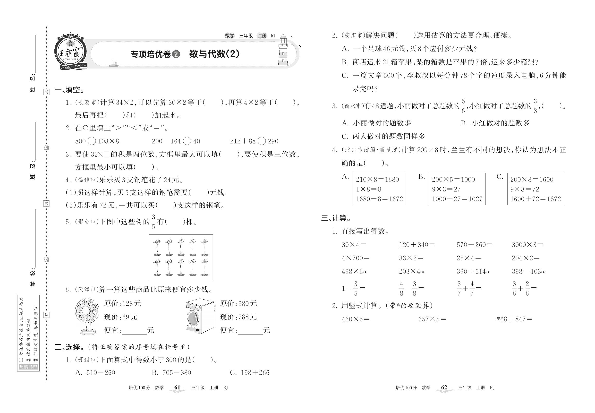 2022上册三年级数学人教版 专项培优卷2 数与代数(2)