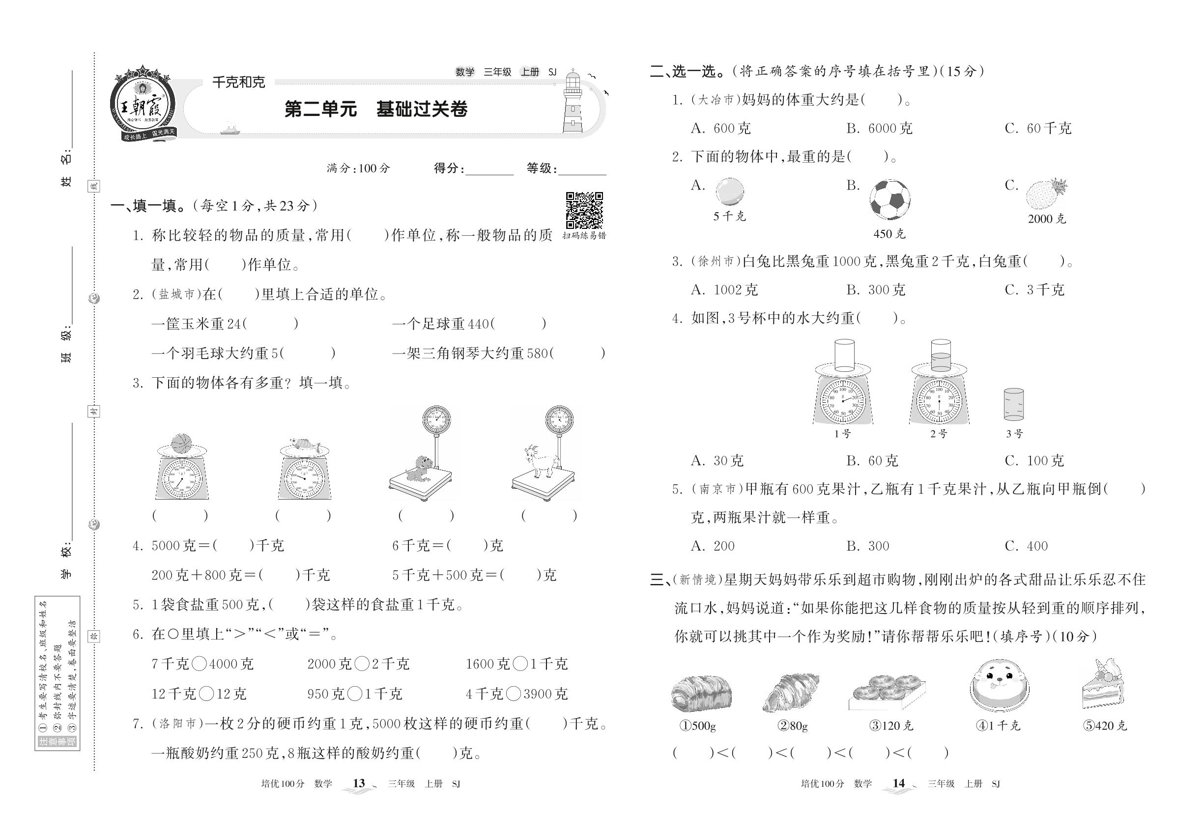 2022上册三年级数学苏教版 第二单元 基础过关卷