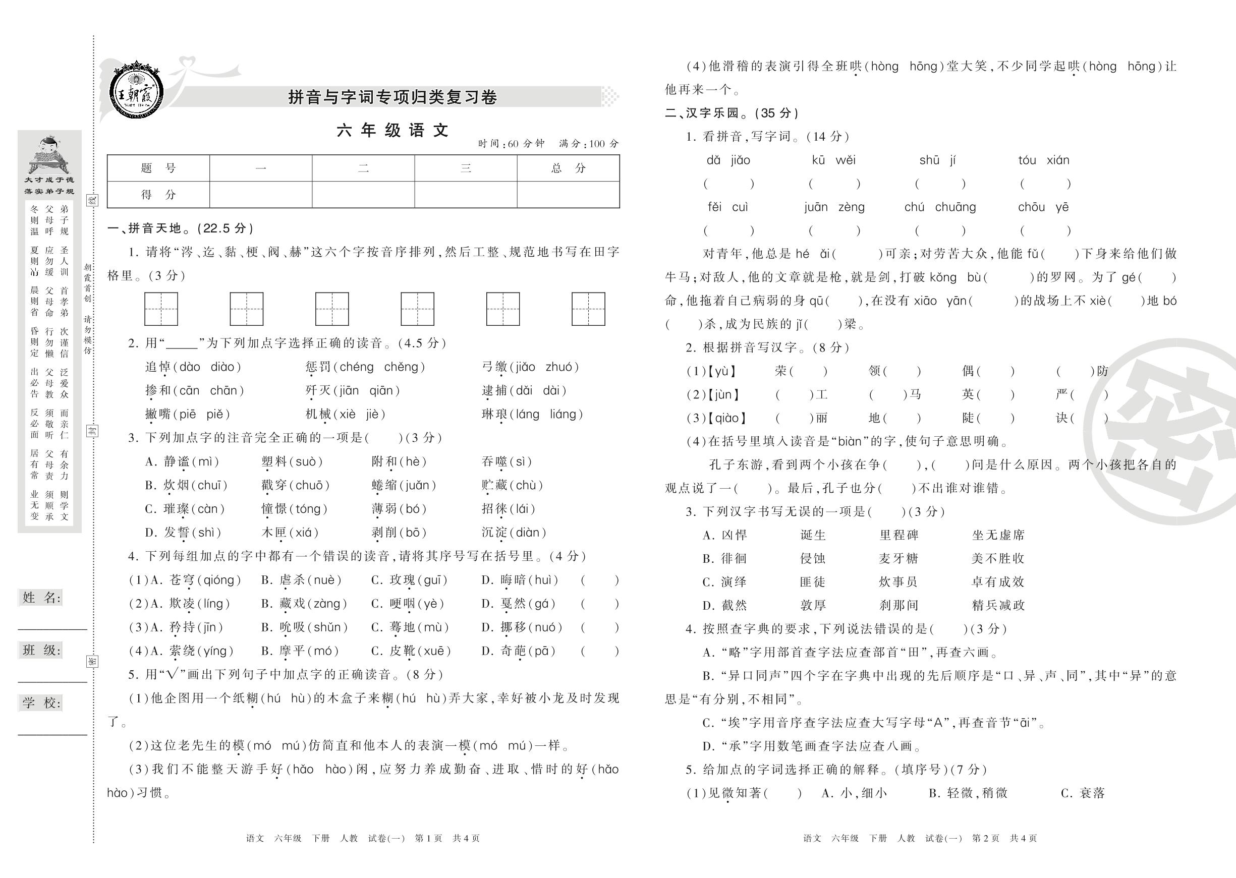 王朝霞期末专项卷六年级下册语文(人教版)_R21080250547【1】