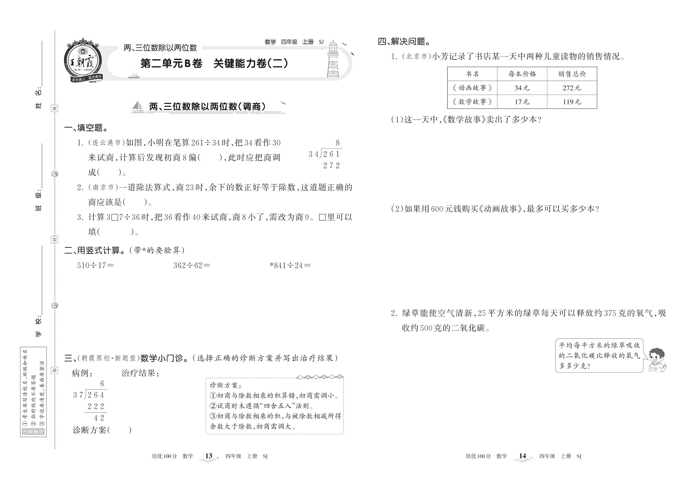 2022上册四年级数学苏教版 第二单元B卷 关键能力卷(二)
