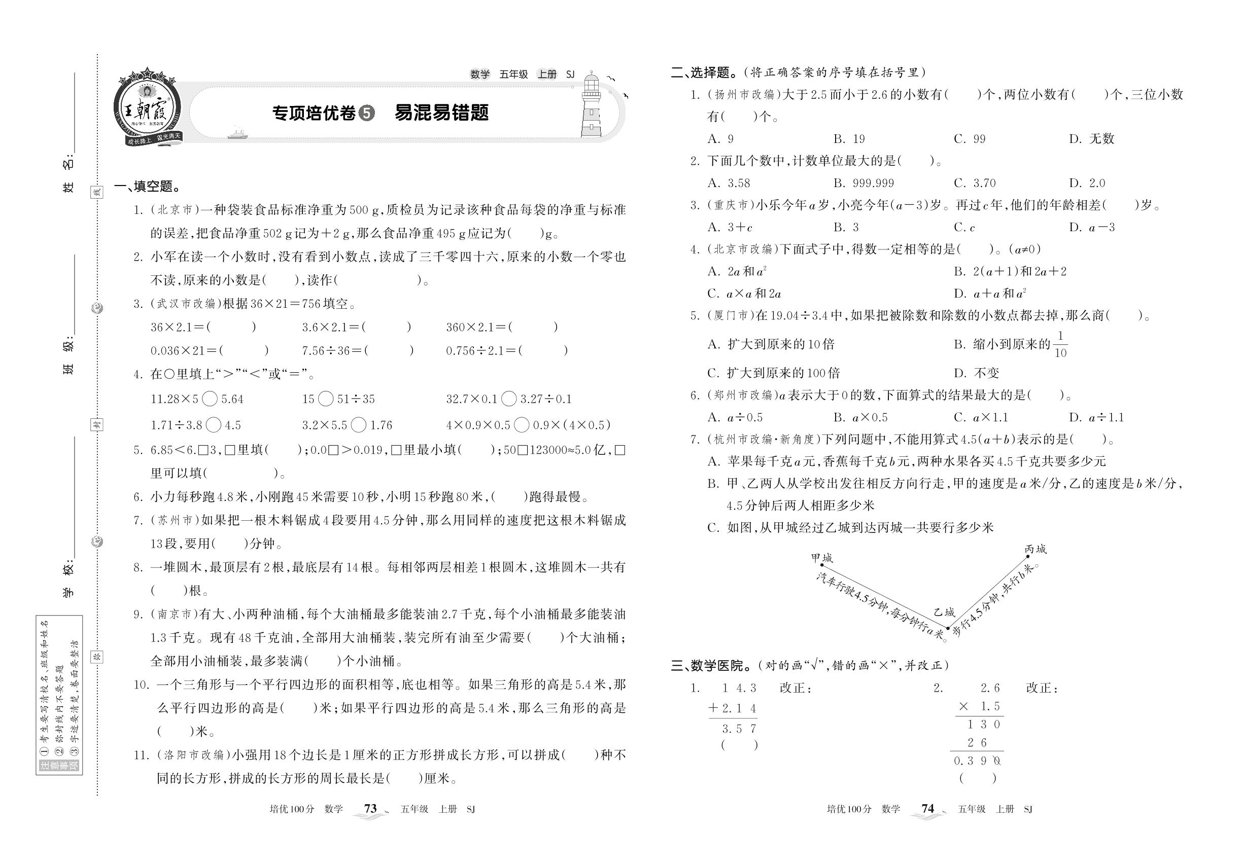 2022上册五年级数学苏教版 专项培优卷5 易混易错题