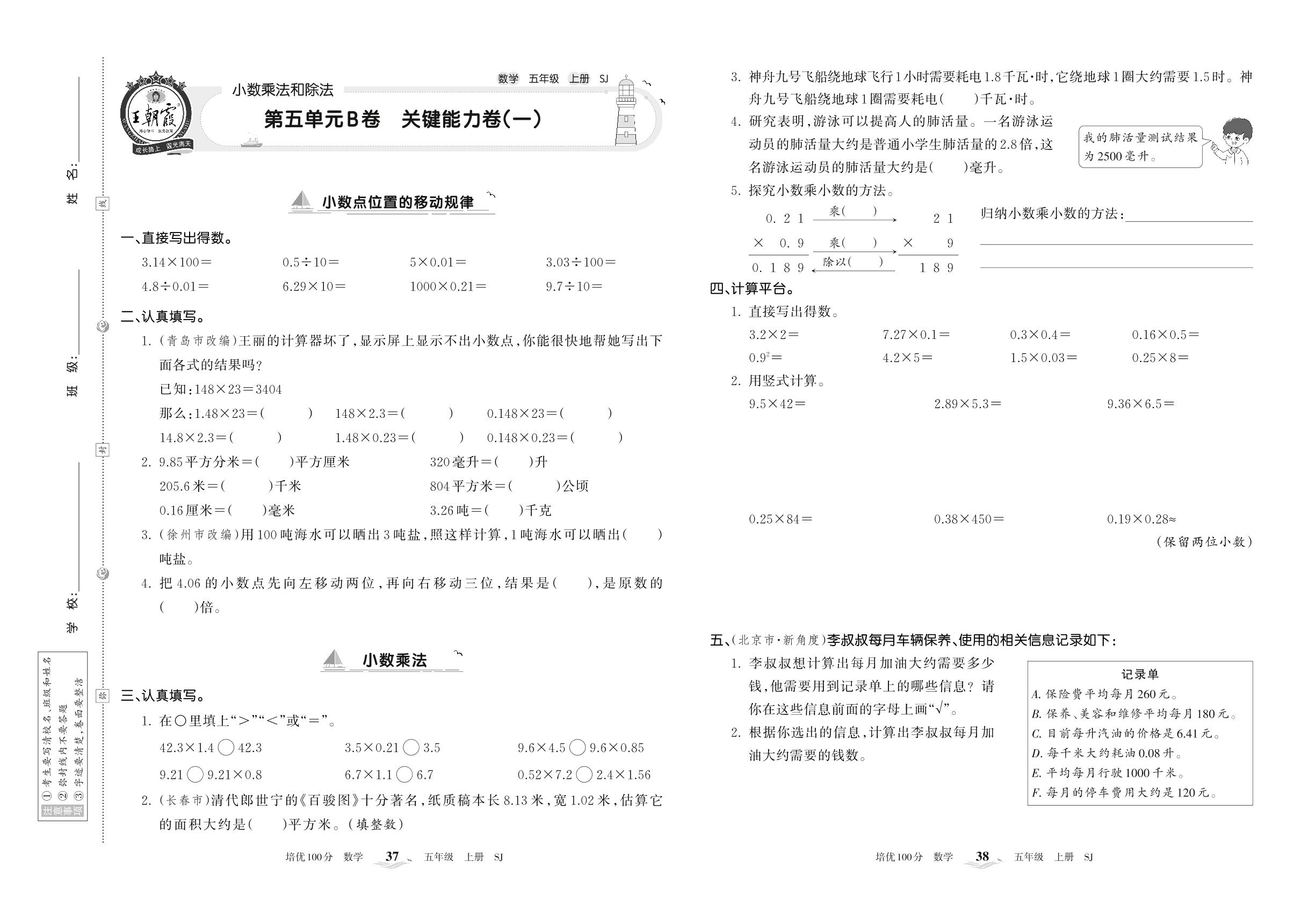 2022上册五年级数学苏教版 第五单元B卷 关键能力卷(一)