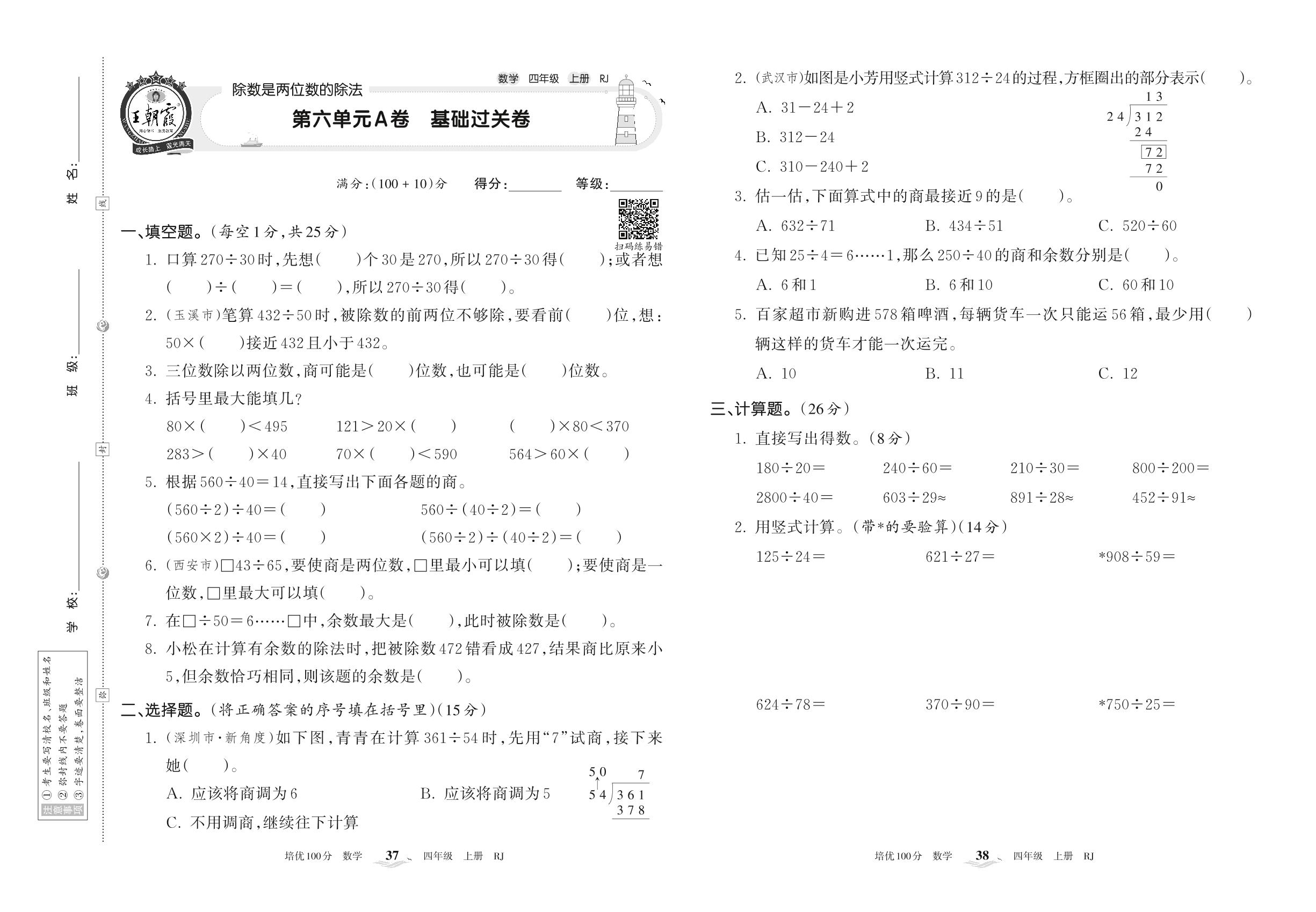 2022上册四年级数学人教版 第六单元A卷 基础过关卷
