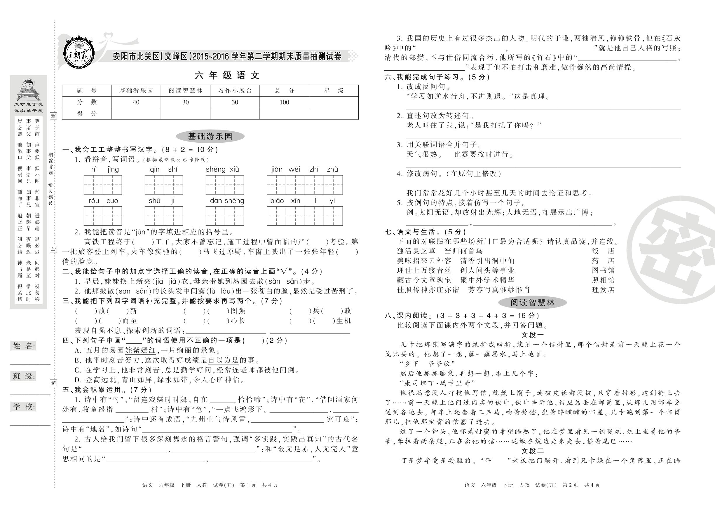 2015-2016学年第二学期安阳市北关区(文峰区)六年级语文试卷(人教版)【5】